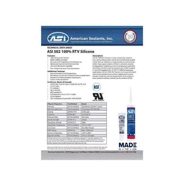 ASI 502 Food Grade 100% RTV Silicone Sealant