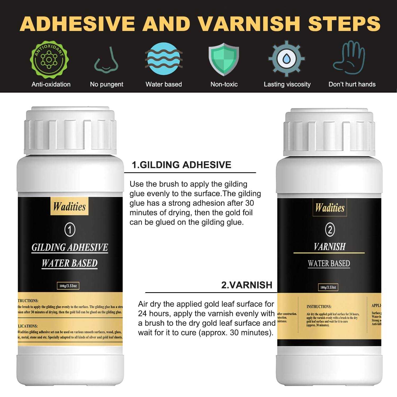 Wadities Gold Leaf Gilding Adhesive Set, 100ml Water Based Metal Leaf Glue and 100ml Varnish