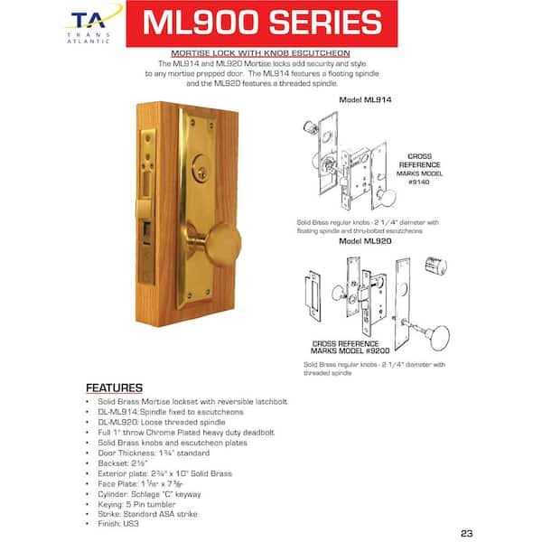 Taco ML900 Series Bright Brass Grade 1 Entry Atrium Mortise Lock with Door Knob Escutcheon DL-ML914-US3