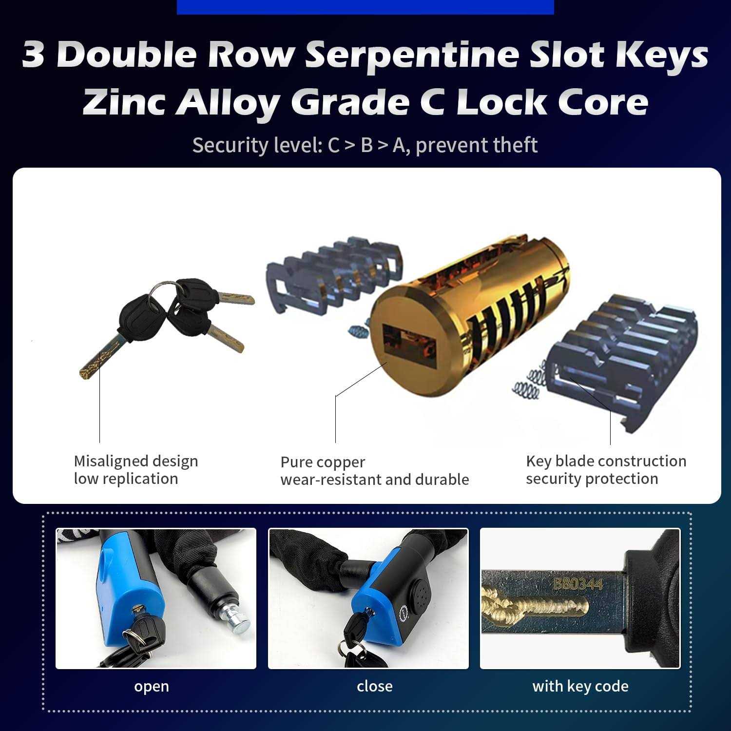 Akm Safe 80db Alarm 4ft/120cm Long Anti Theft Heavy Duty Motorcycle Chain Lock 3/8”/10mm Thick Weather Proof Durable Chains with 3 Customized Keys