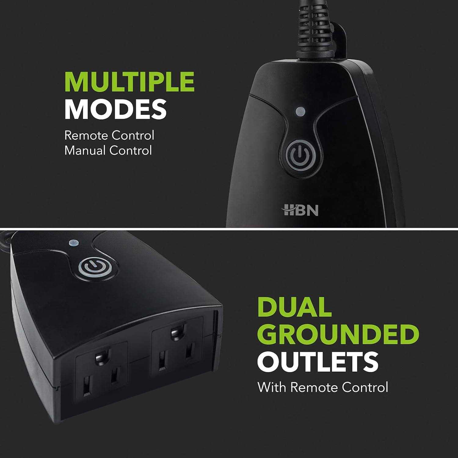 HBN Outdoor Indoor Wireless Remote Control Dual 3-Prong Outlet Weatherproof Heavy Duty 15 A Compact 2 Grounded Outlets with Remote