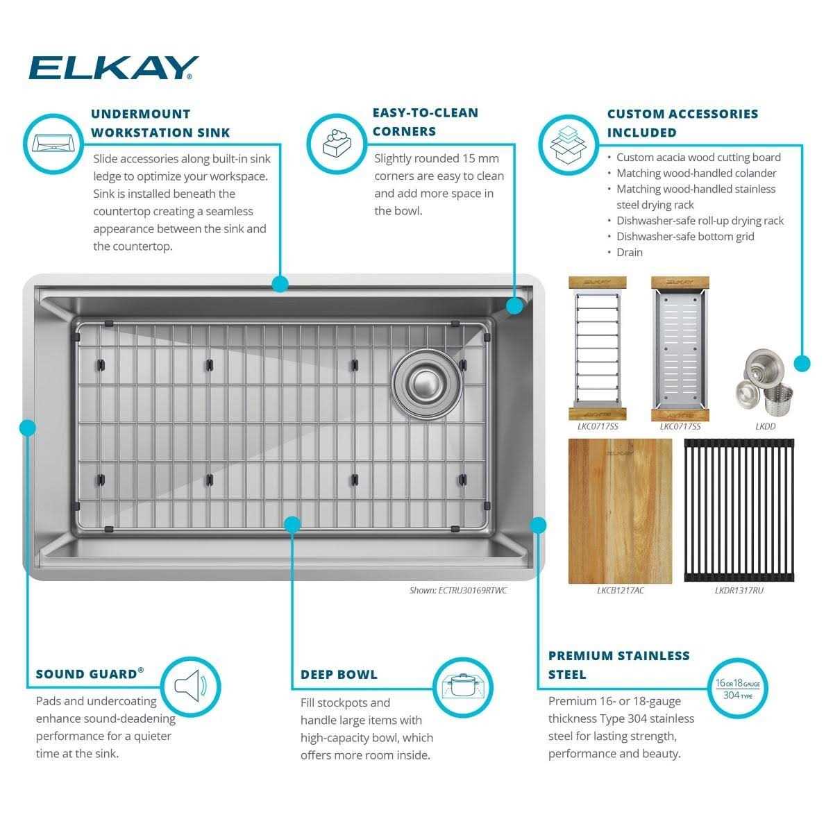 Elkay ECTRU30169RTWC Crosstown 18-Gauge Workstation Stainless Steel Single Bowl Undermount Sink Kit