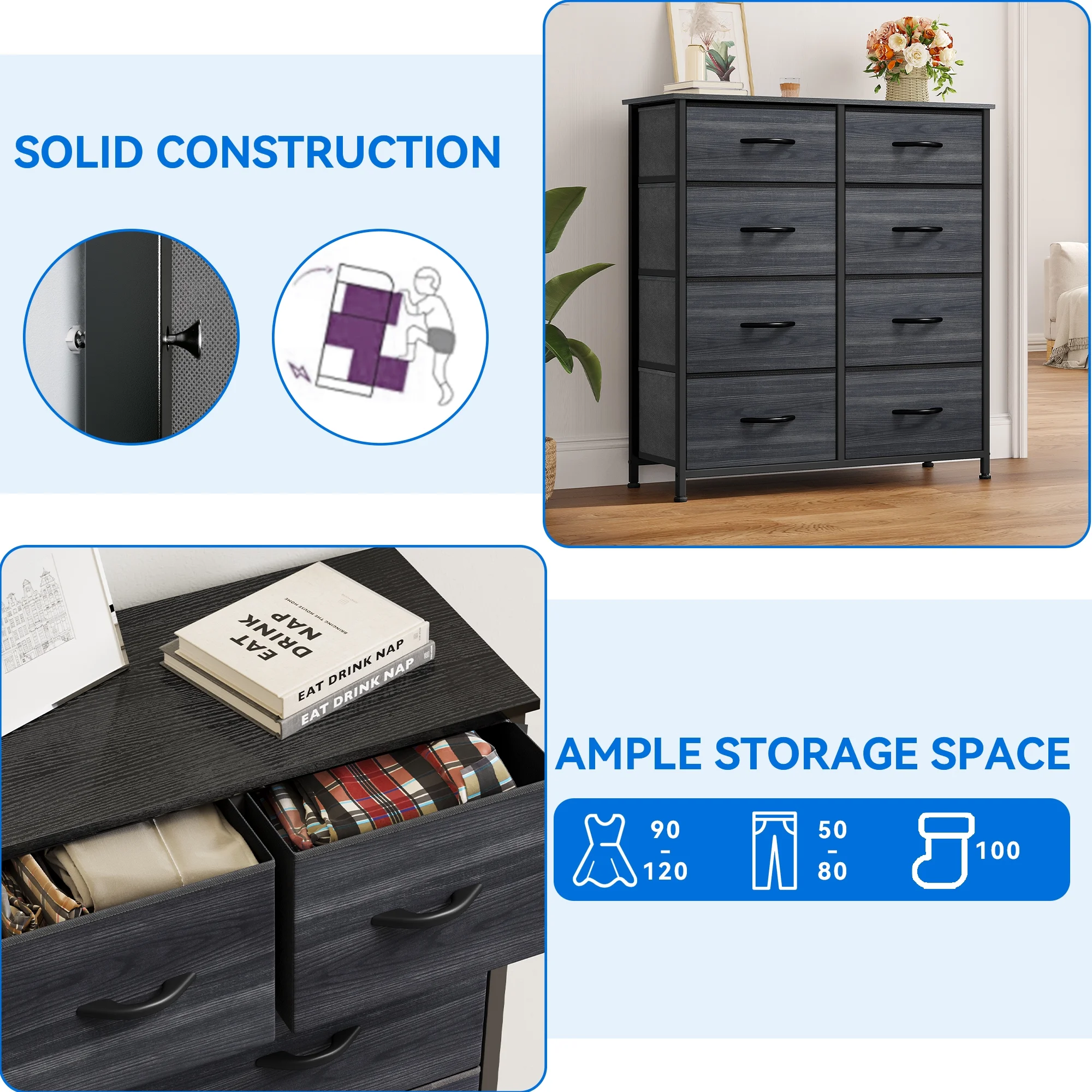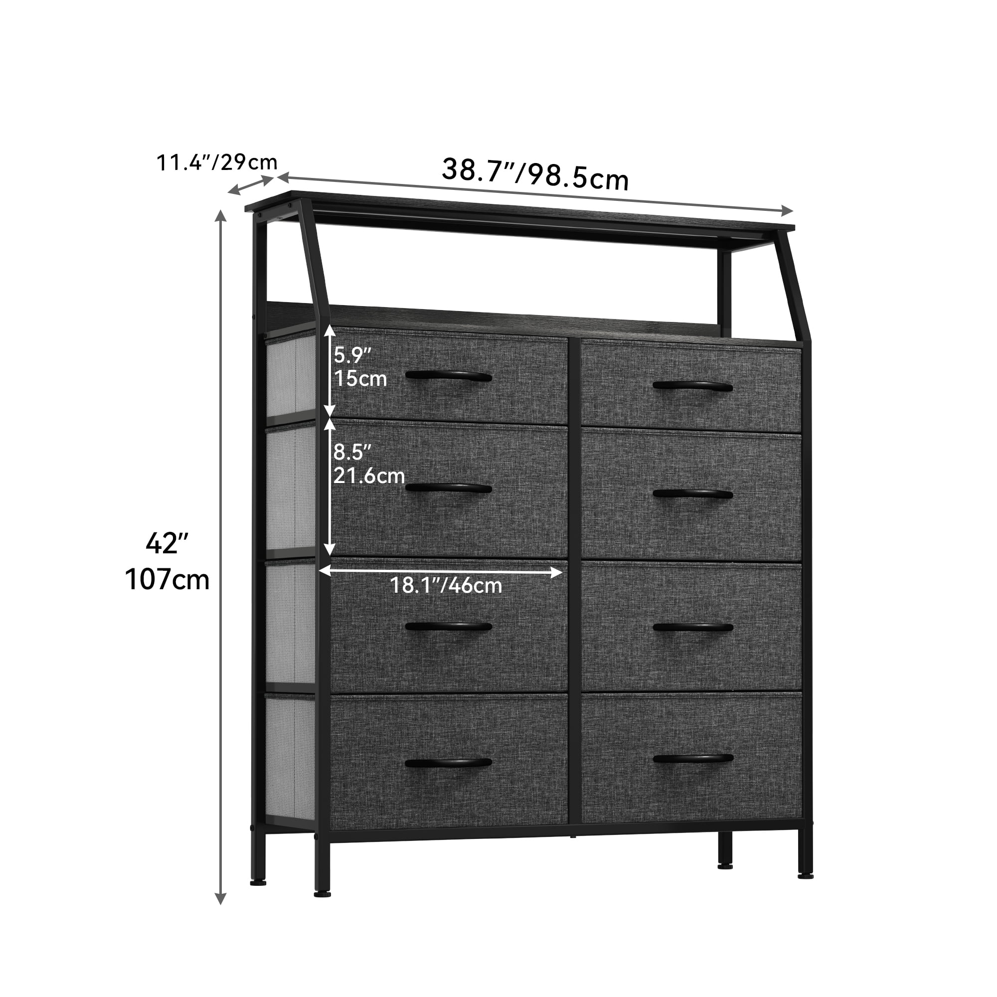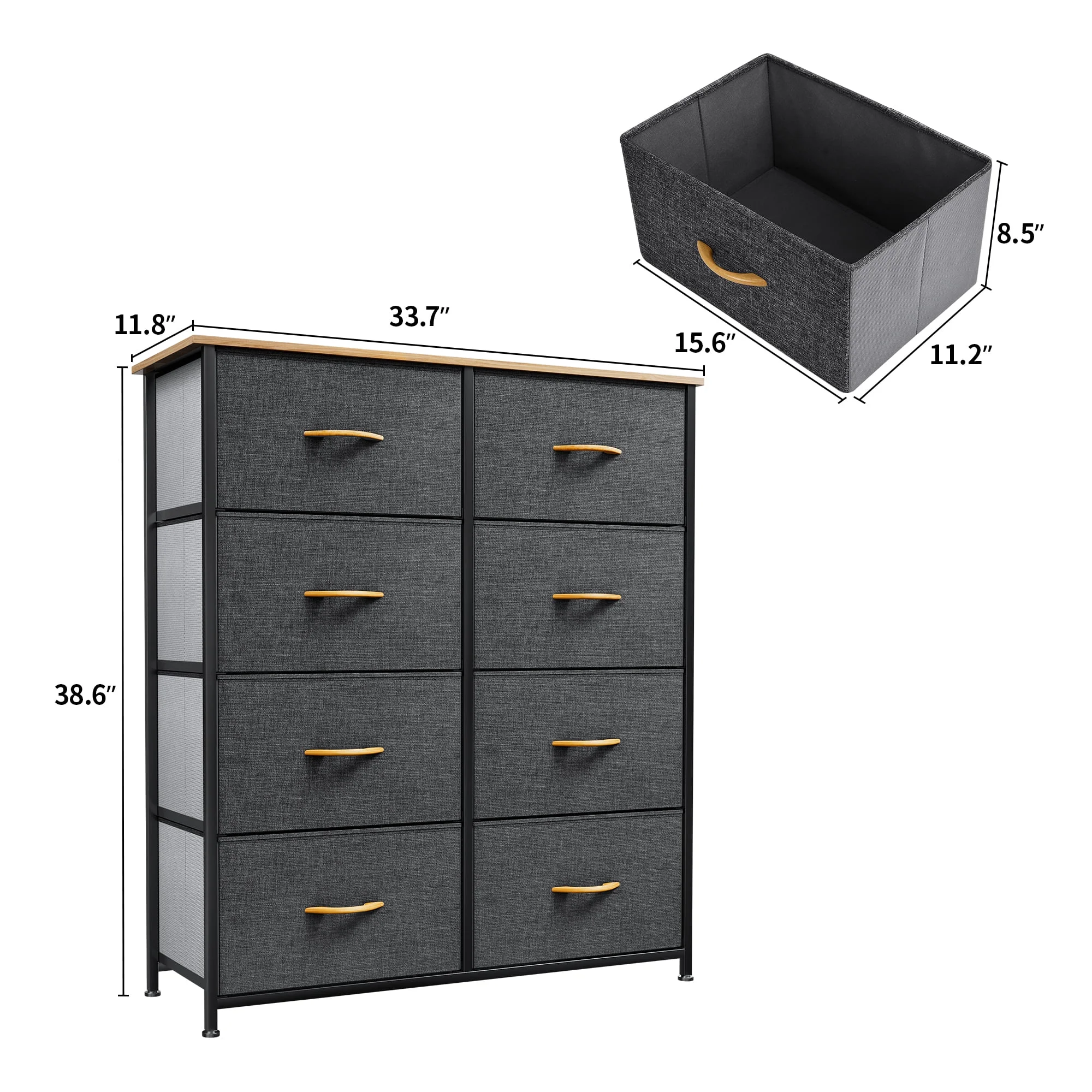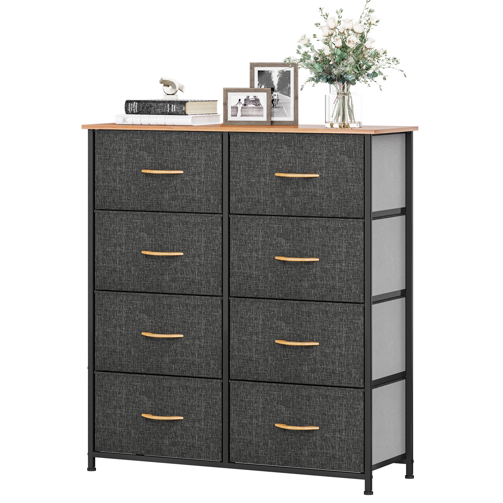 Dextrus 8 Drawer Dresser for Bedroom Fabric Dresser Chest of Closets Storage Units Organizer Tower Wooden Top Shelf, for Bedroom, Hallway, Entryway, Closet(Black Grey)