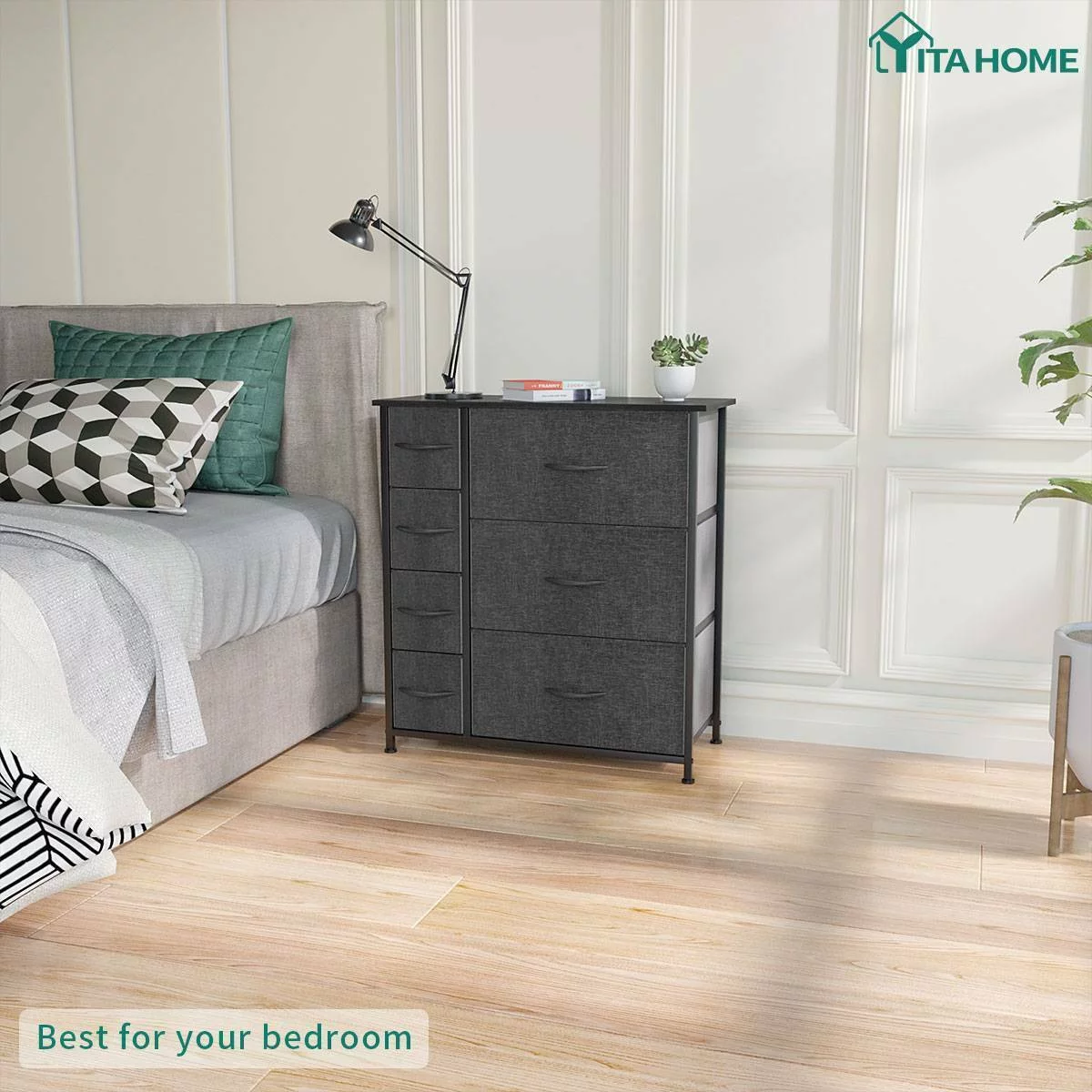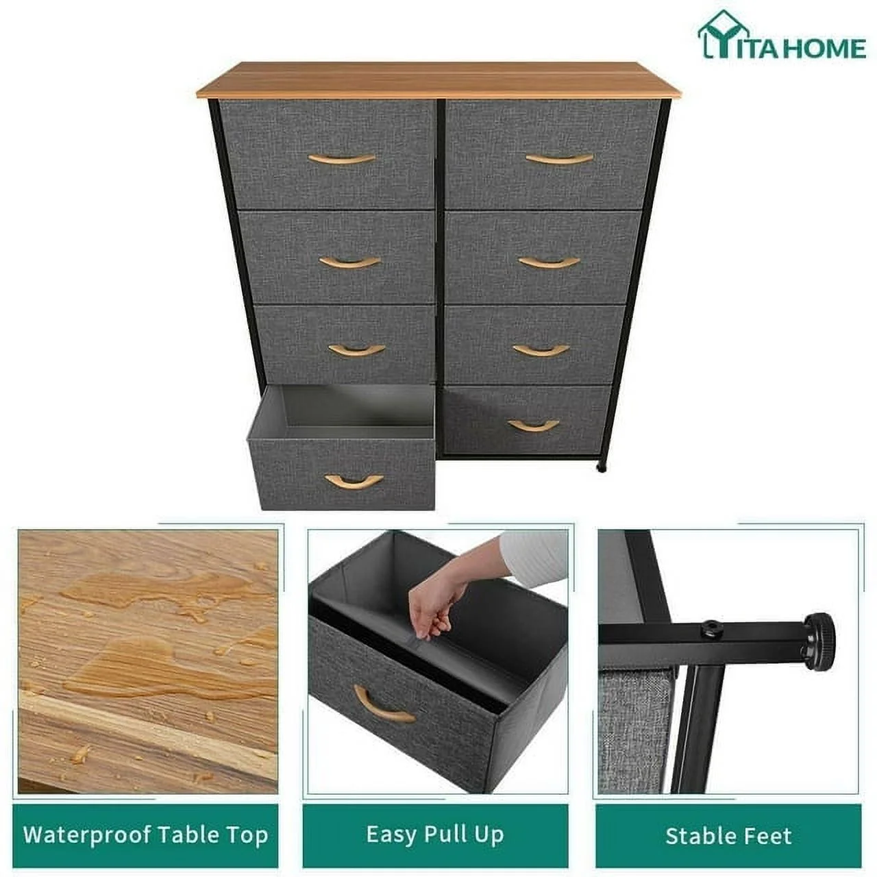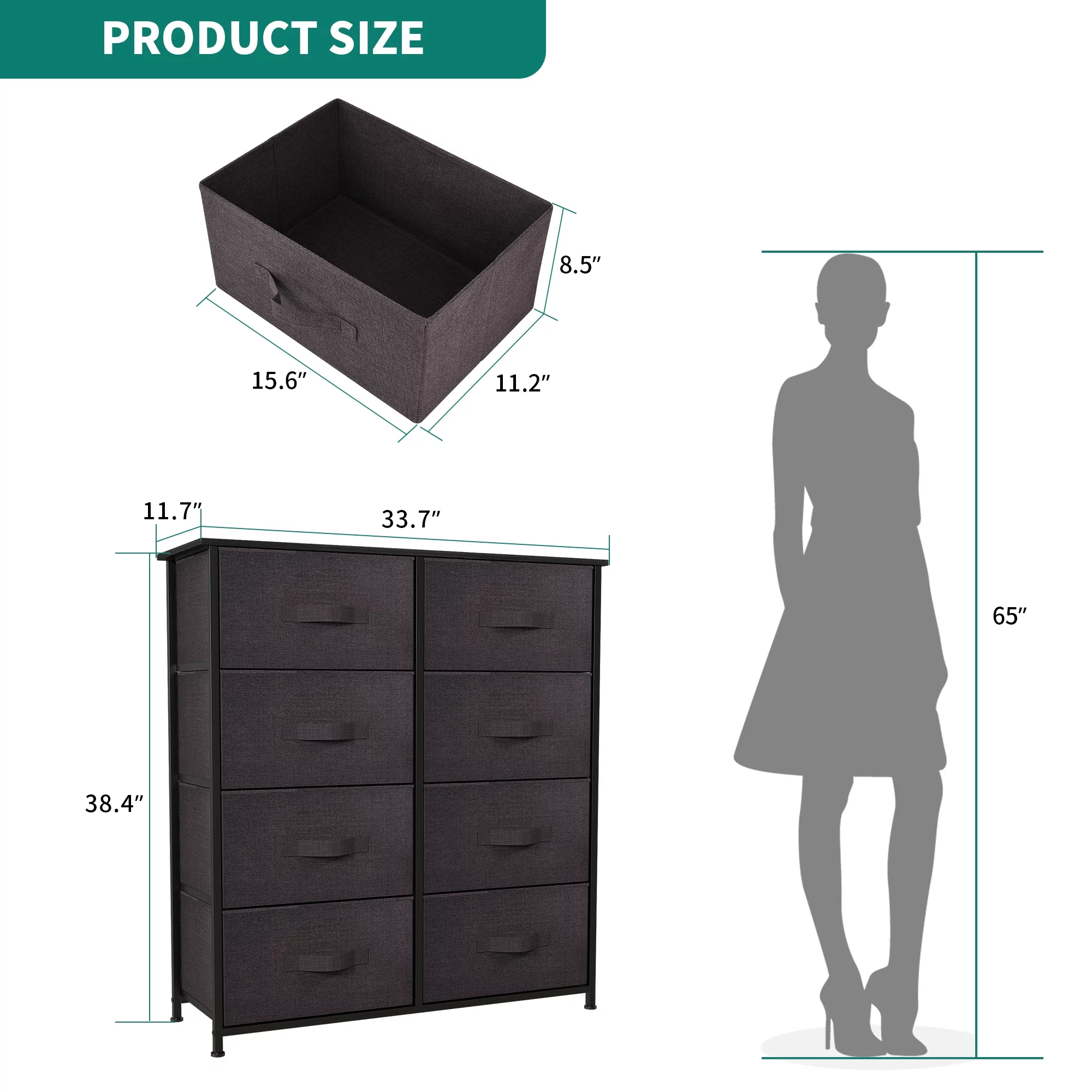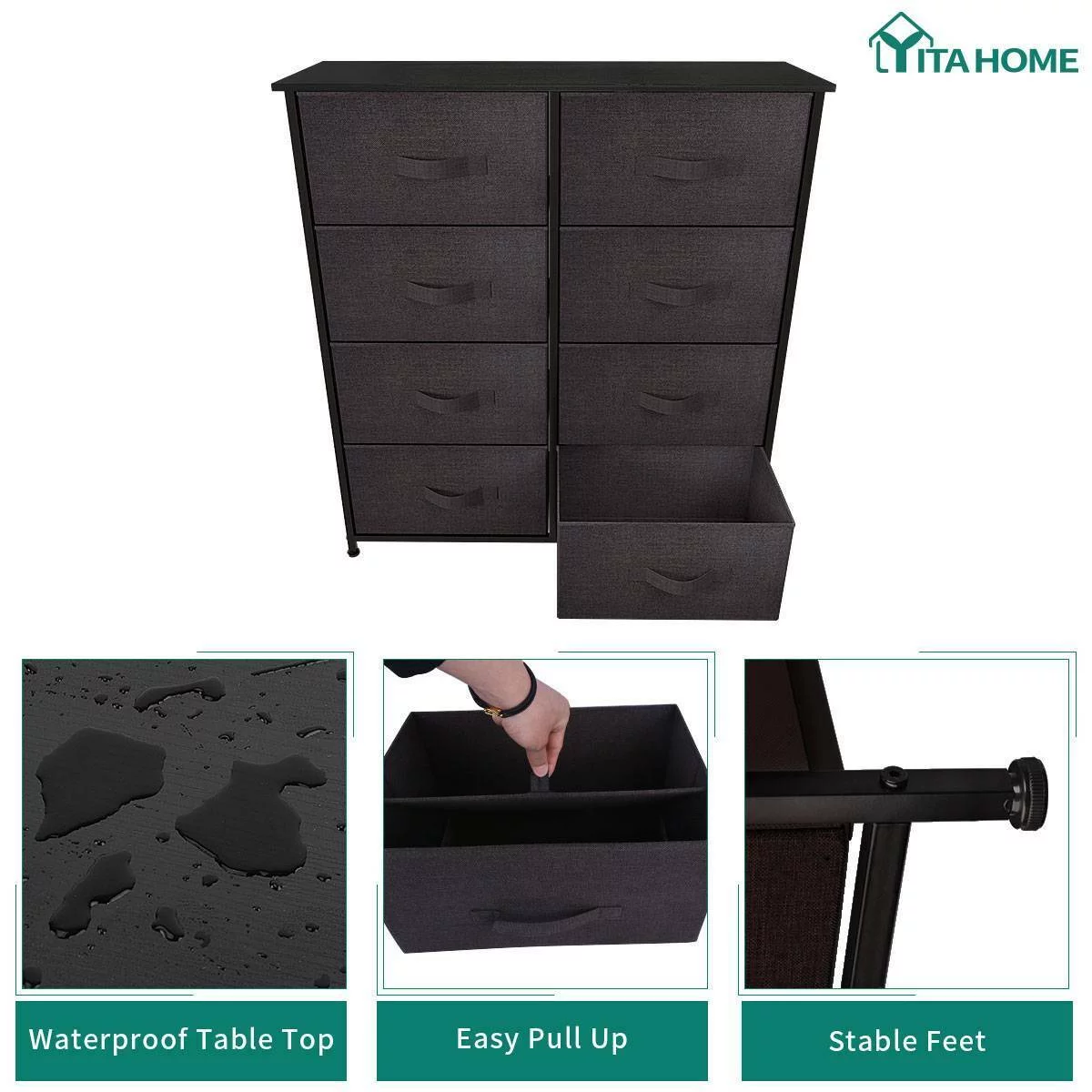 Dextrus 8 Drawer Dresser for Bedroom Fabric Dresser Chest of Closets Storage Units Organizer Tower Wooden Top Shelf, for Bedroom, Hallway, Entryway, Closet(Black Grey)
