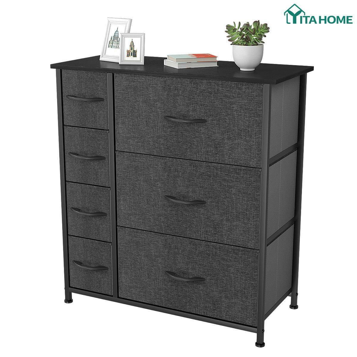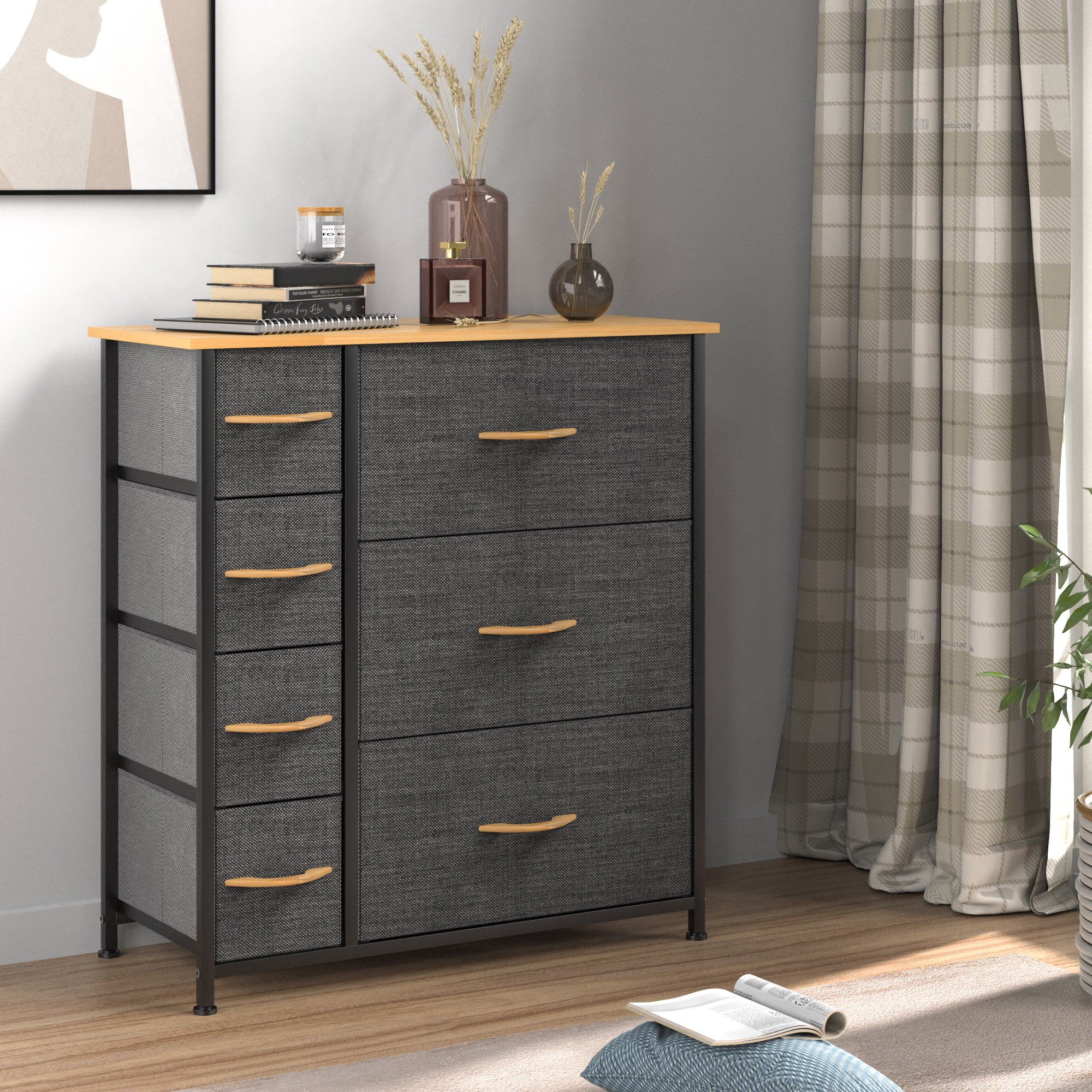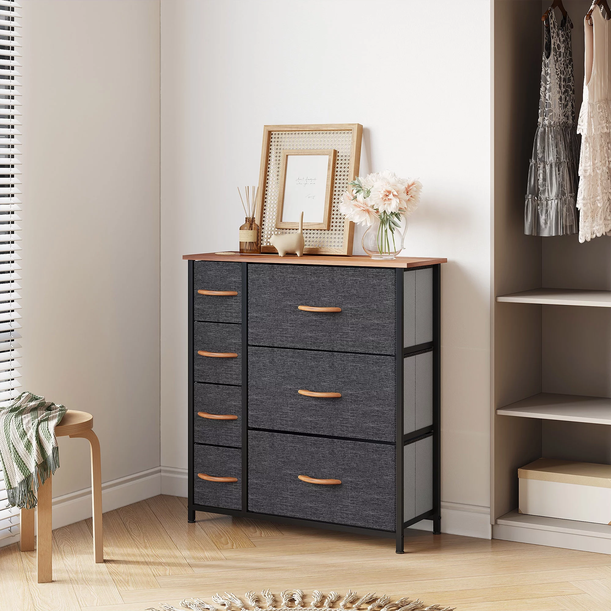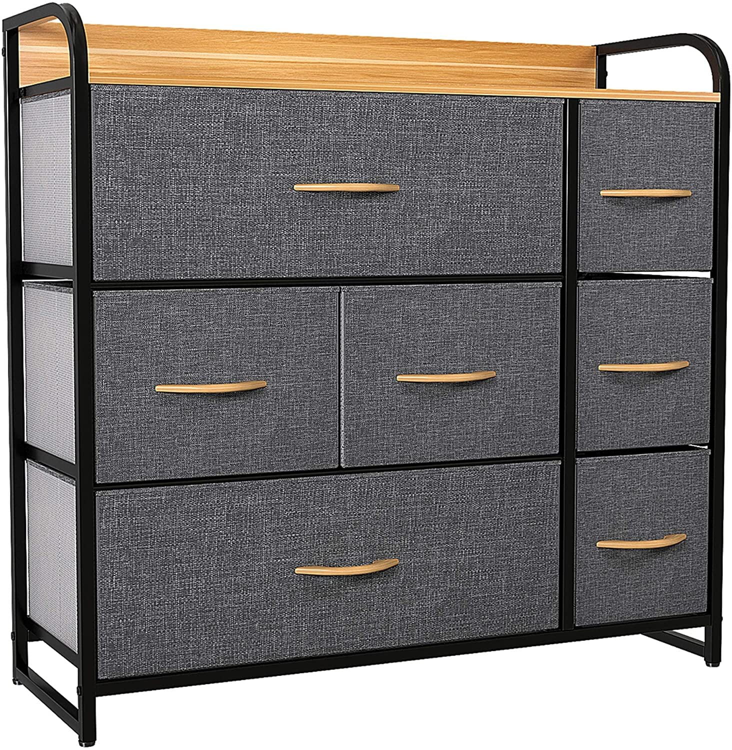 Dextrus 7 Drawers Dresser Fabric Storage Tower Wooden Top Shelf Modern Organizer, Dark Gray