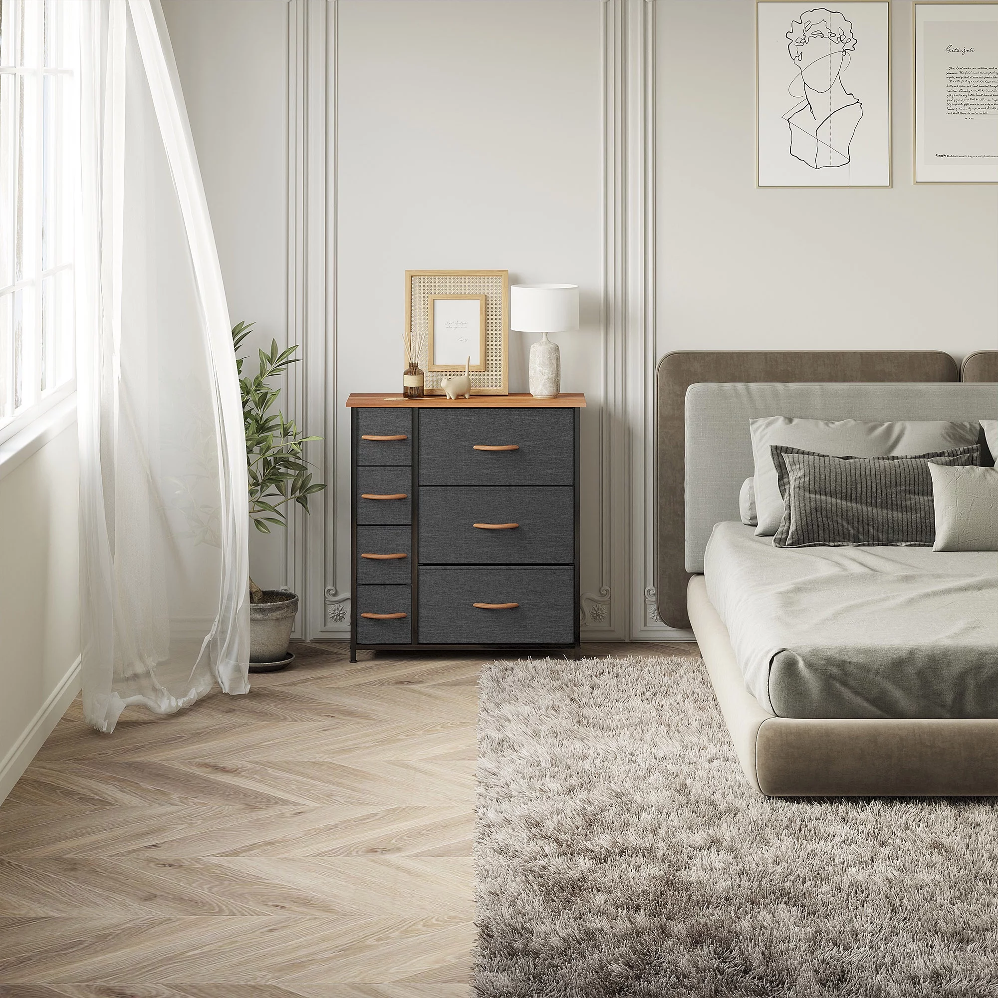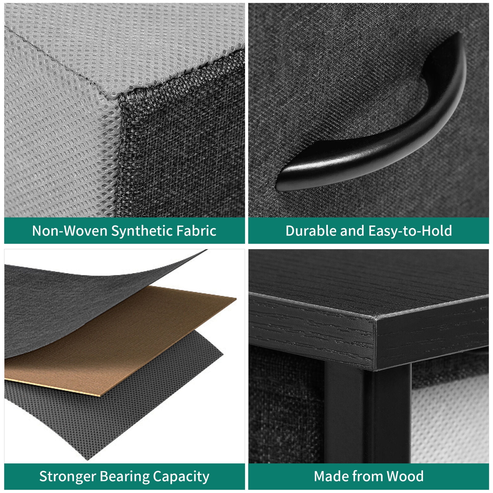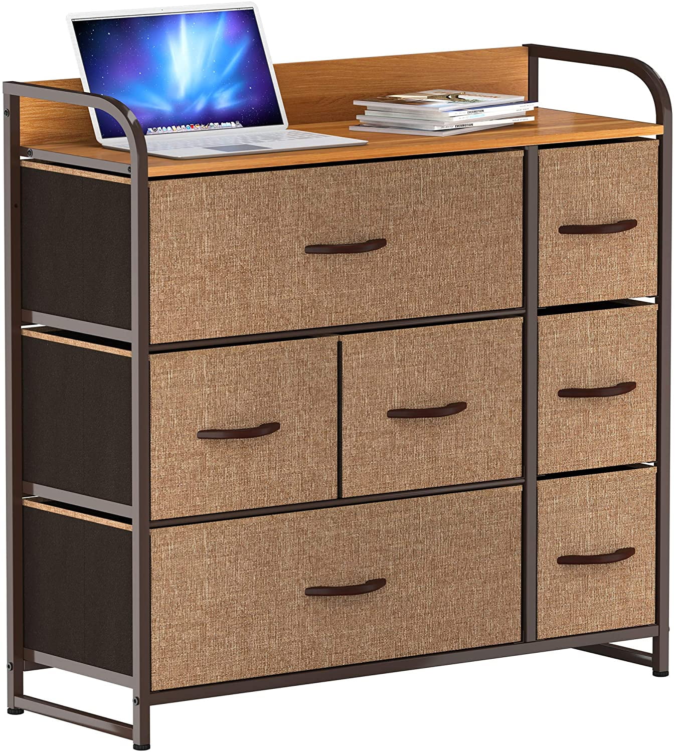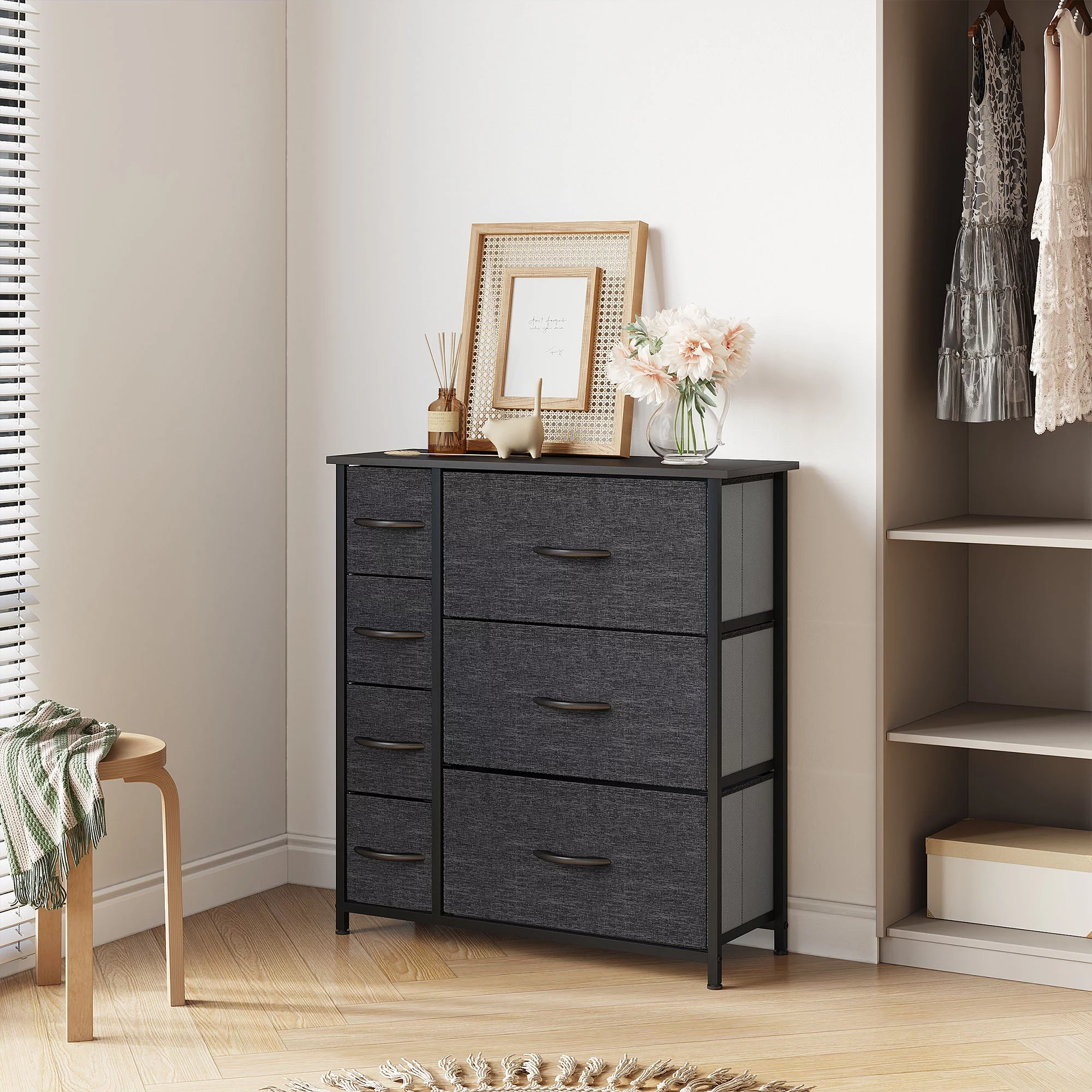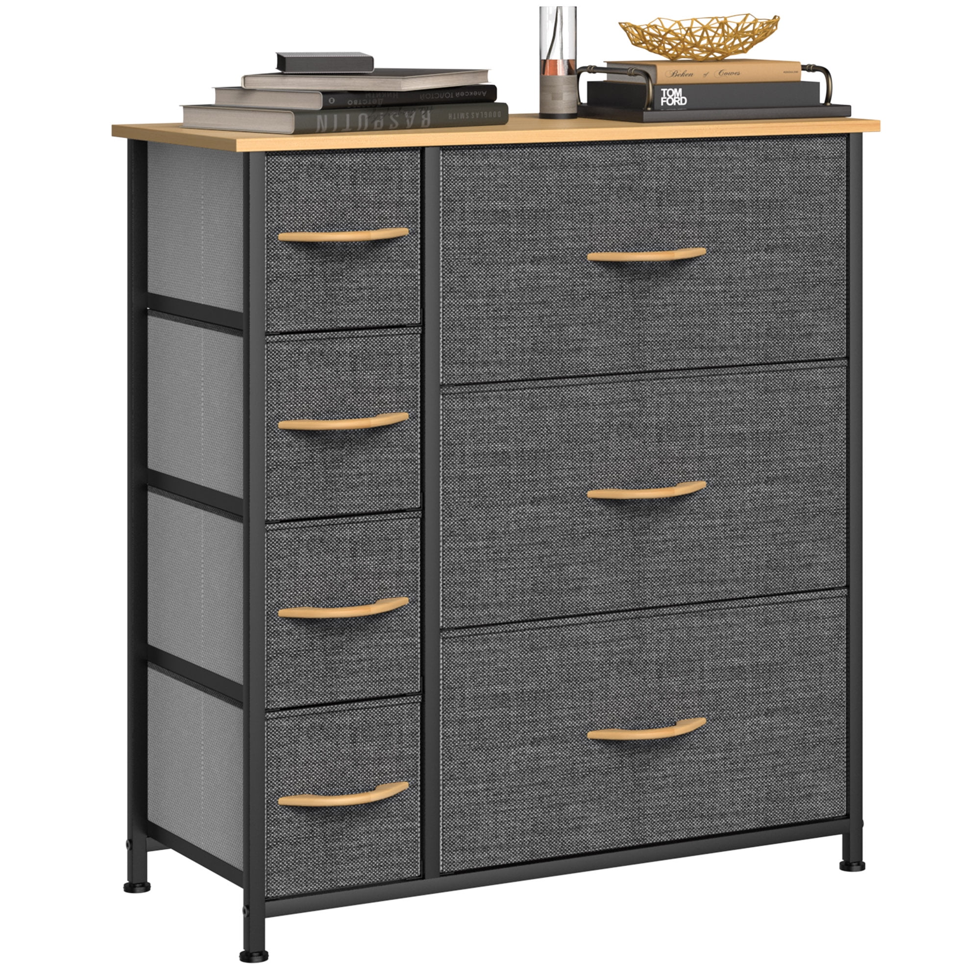 Dextrus 7 Drawers Dresser Fabric Storage Tower Wooden Top Shelf Modern Organizer, Dark Gray
