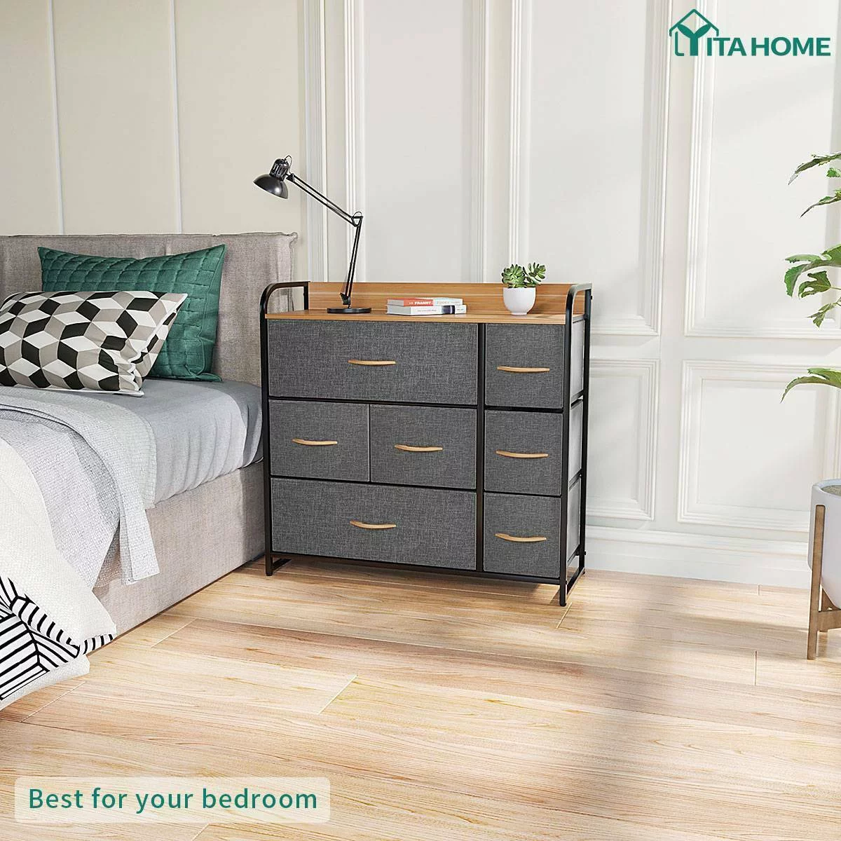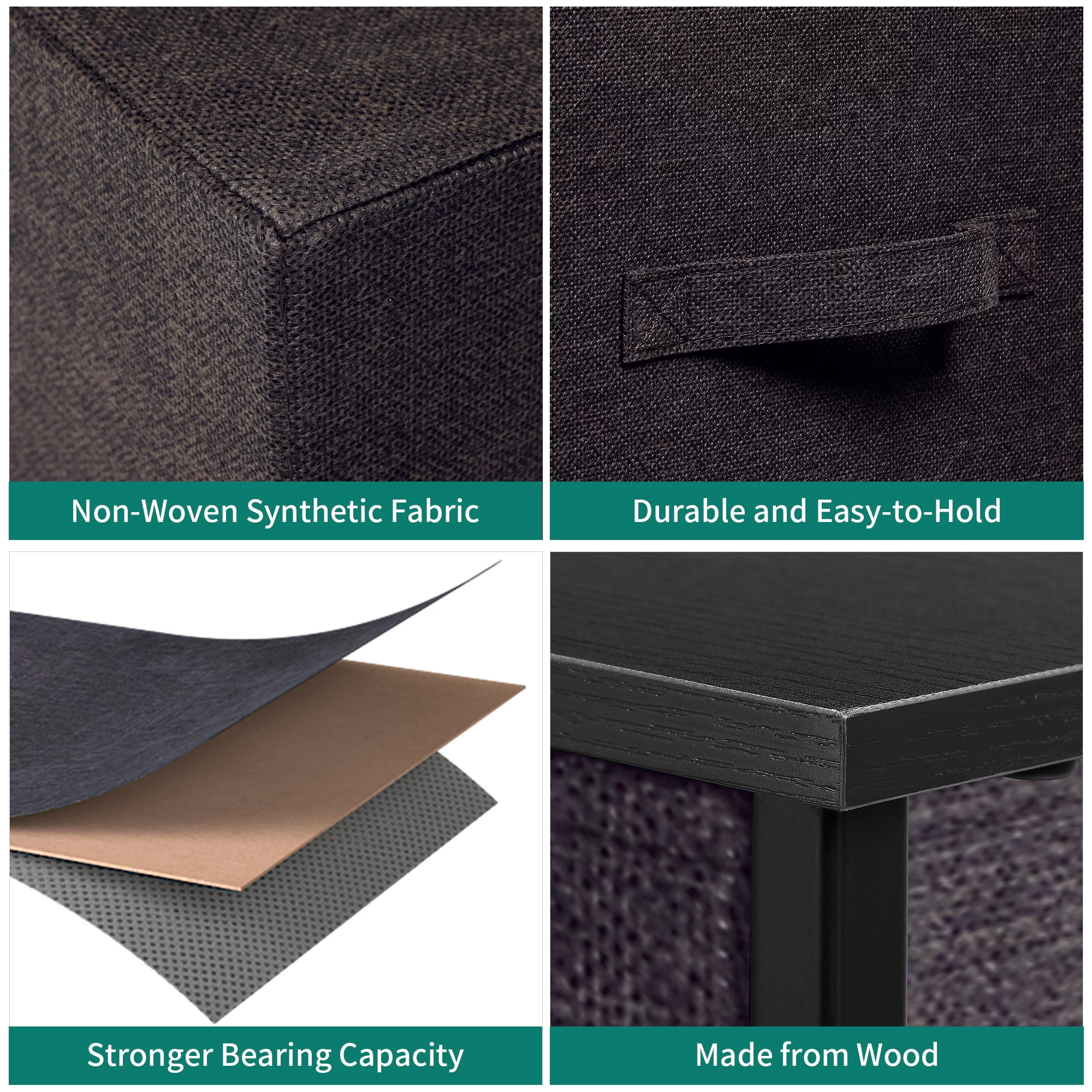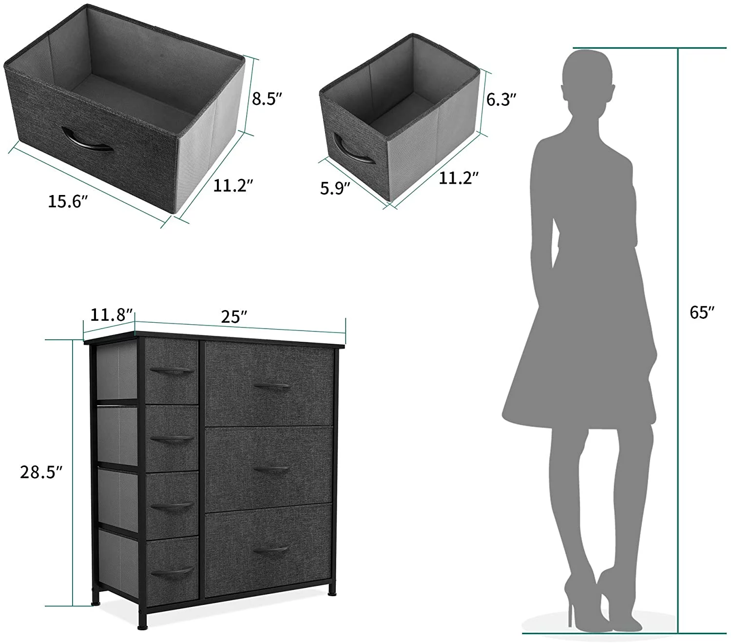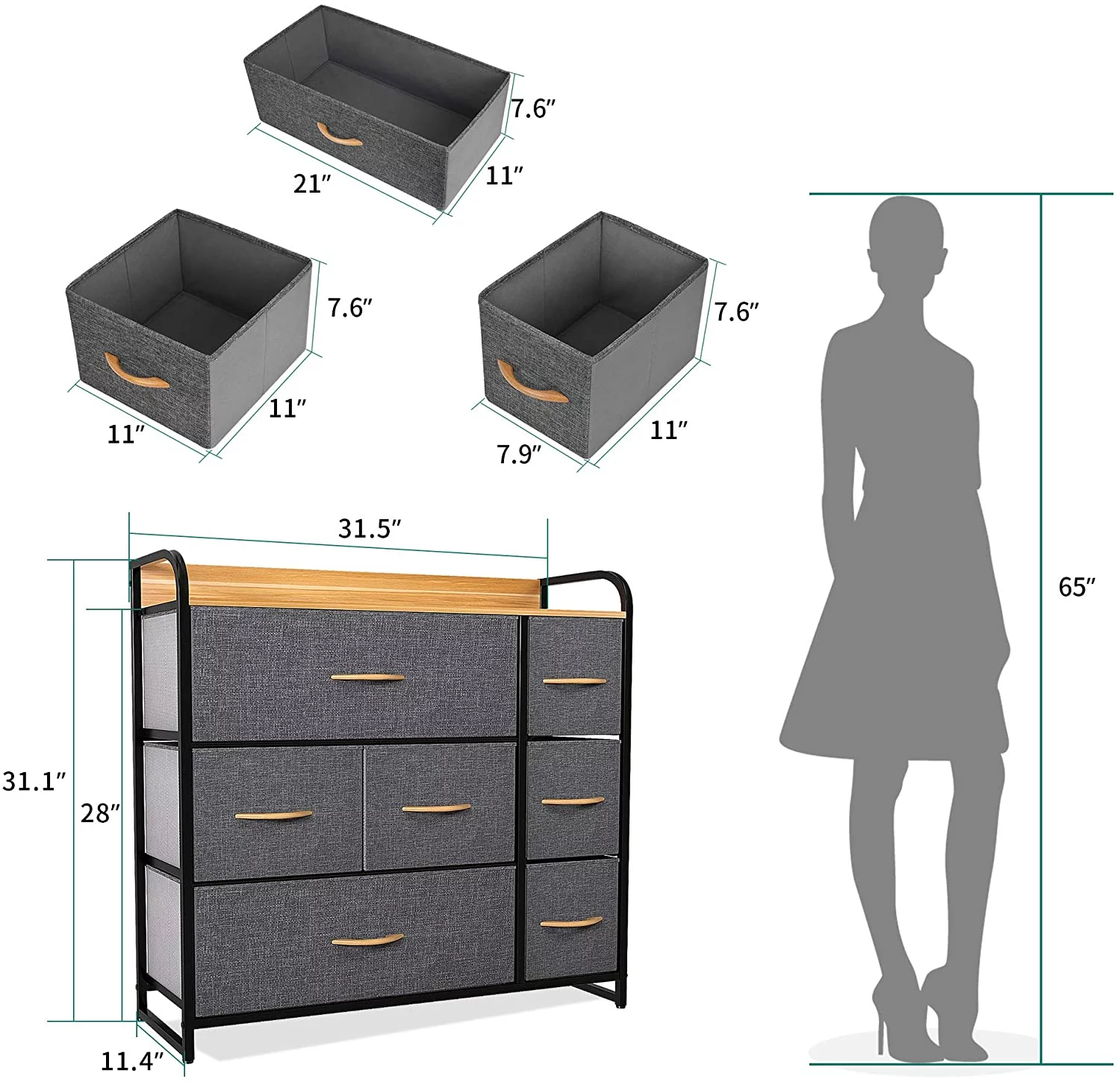 Dextrus 7 Drawers Dresser Fabric Storage Tower Wooden Top Shelf Modern Organizer, Dark Gray