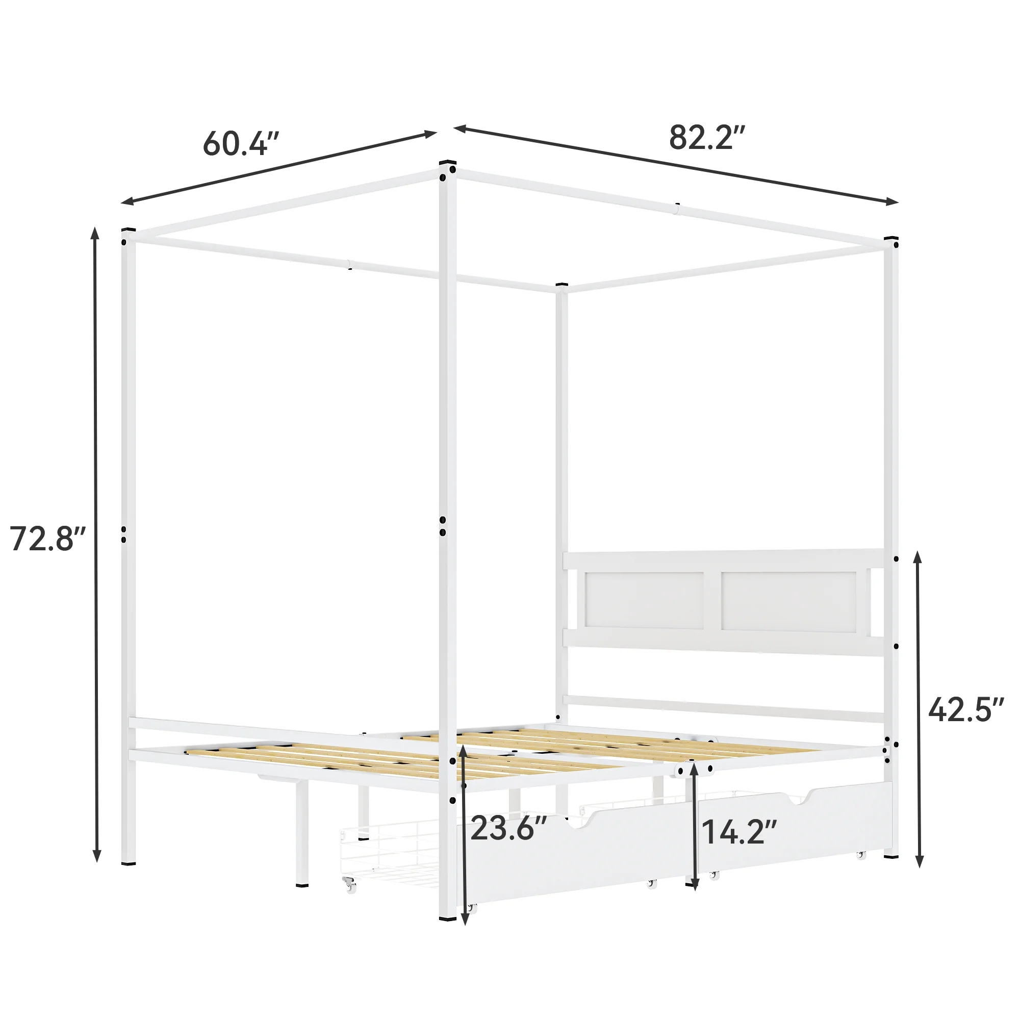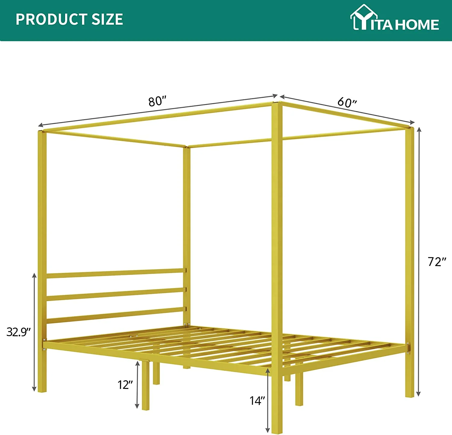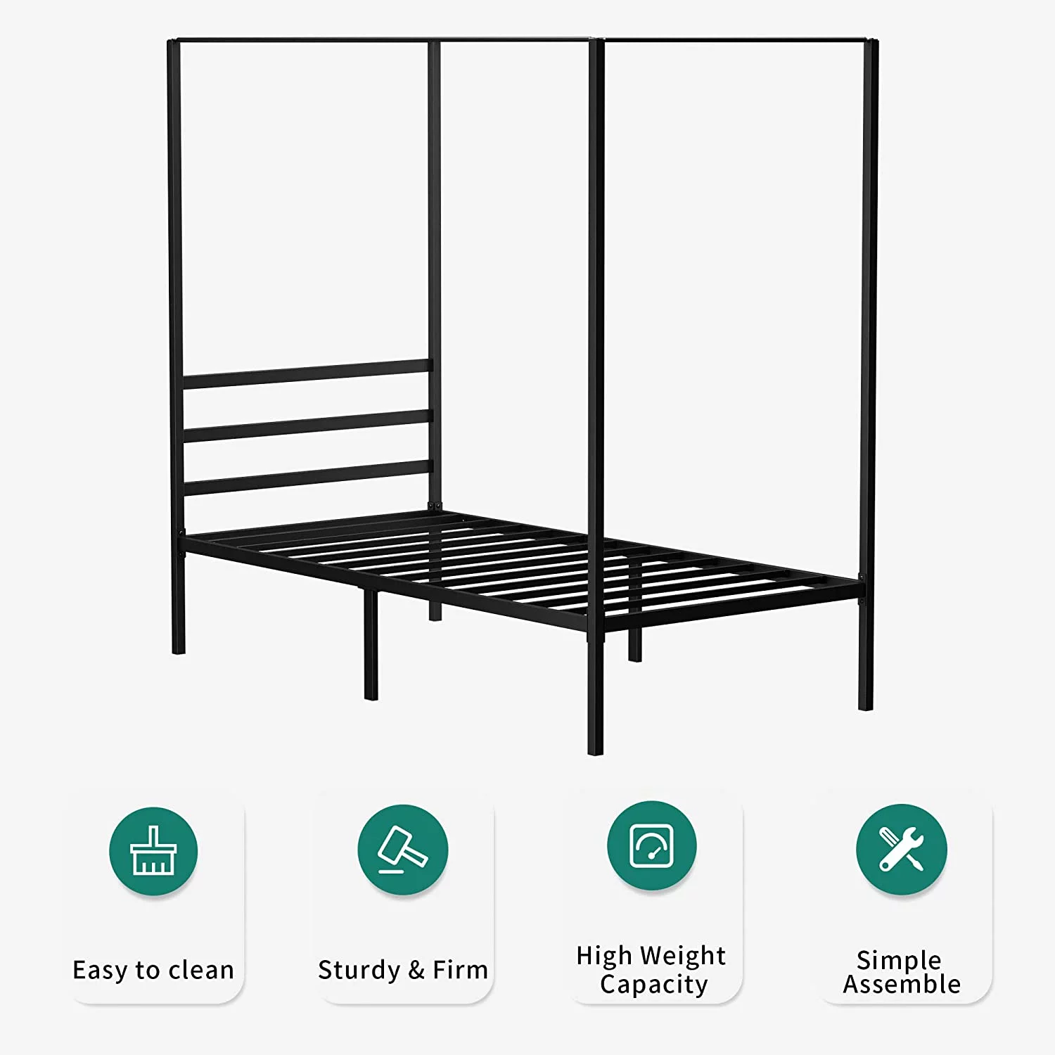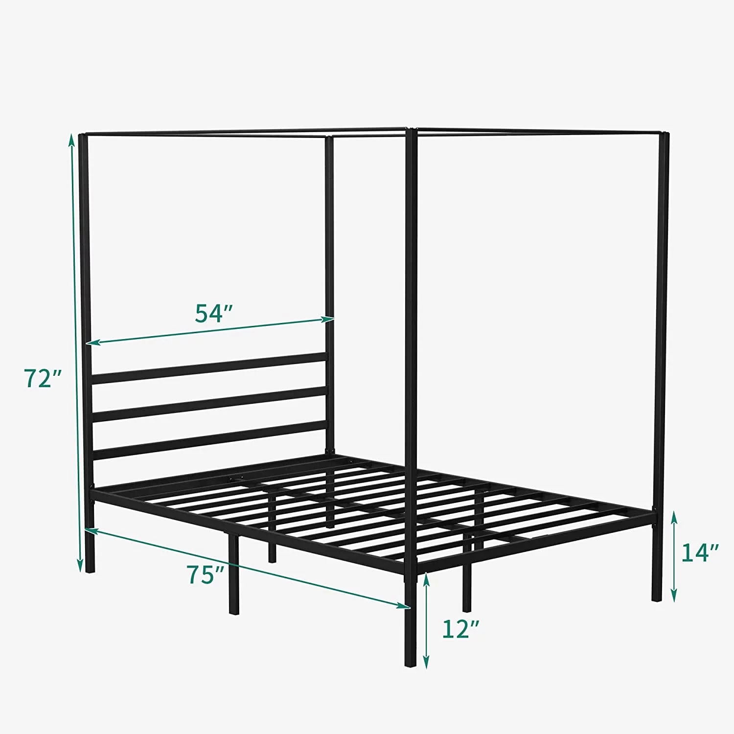 Dextrus Metal Canopy Bed Frame 14" Platform with Headboard Strong Metal Slat Support Mattress Foundation, No Box Spring Needed, Black, Queen Size