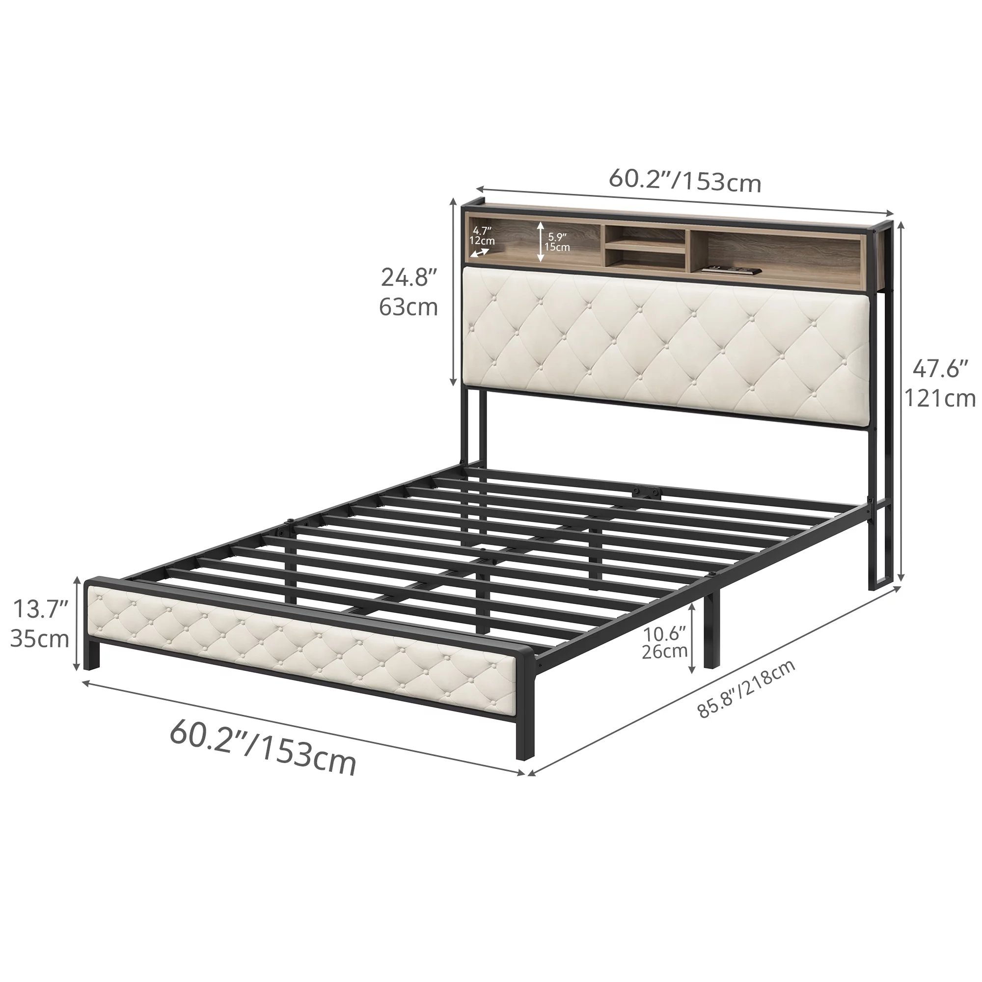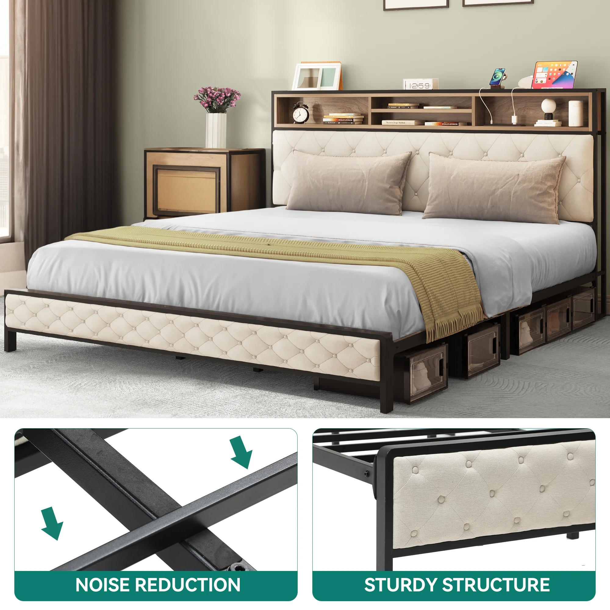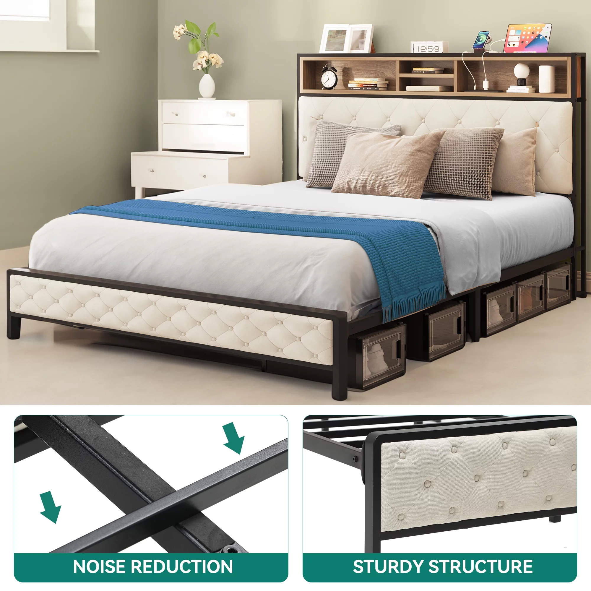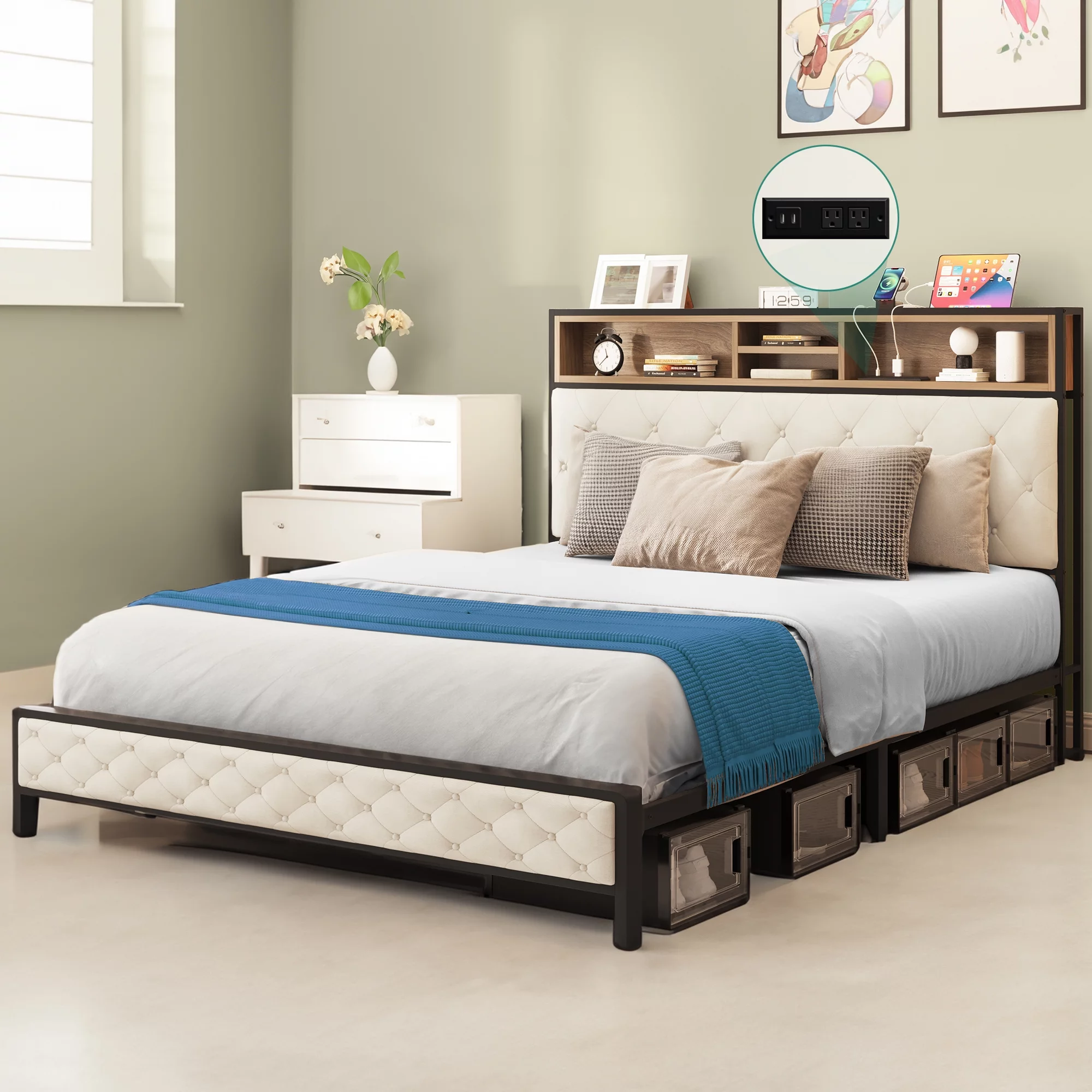 Dextrus Queen Size Bed Frame with Charging Station Footboard Metal Slats, and Storage Headboard, Beige