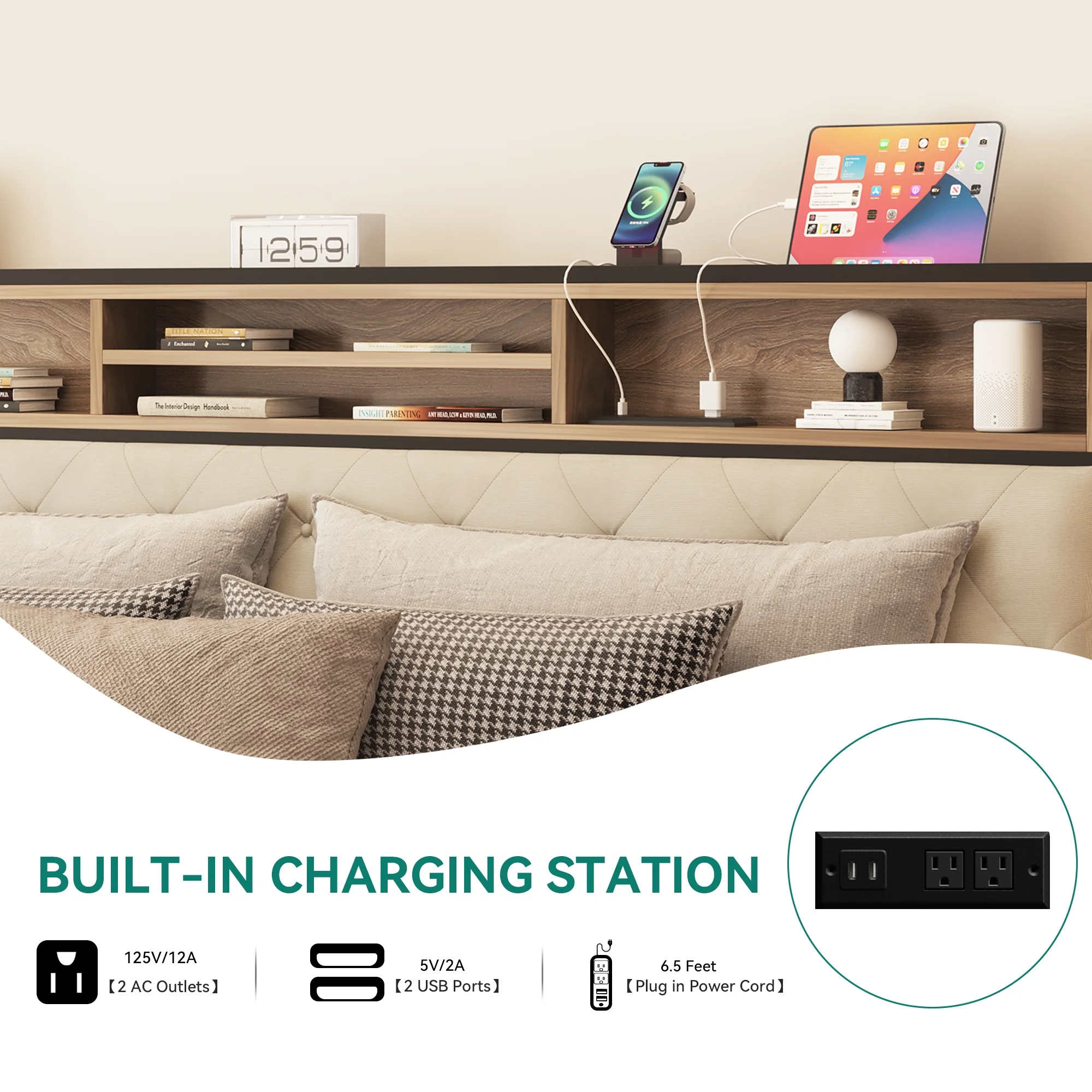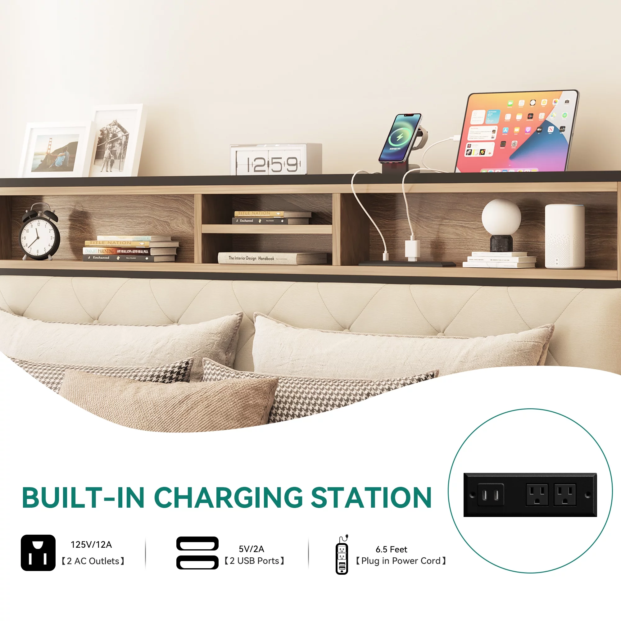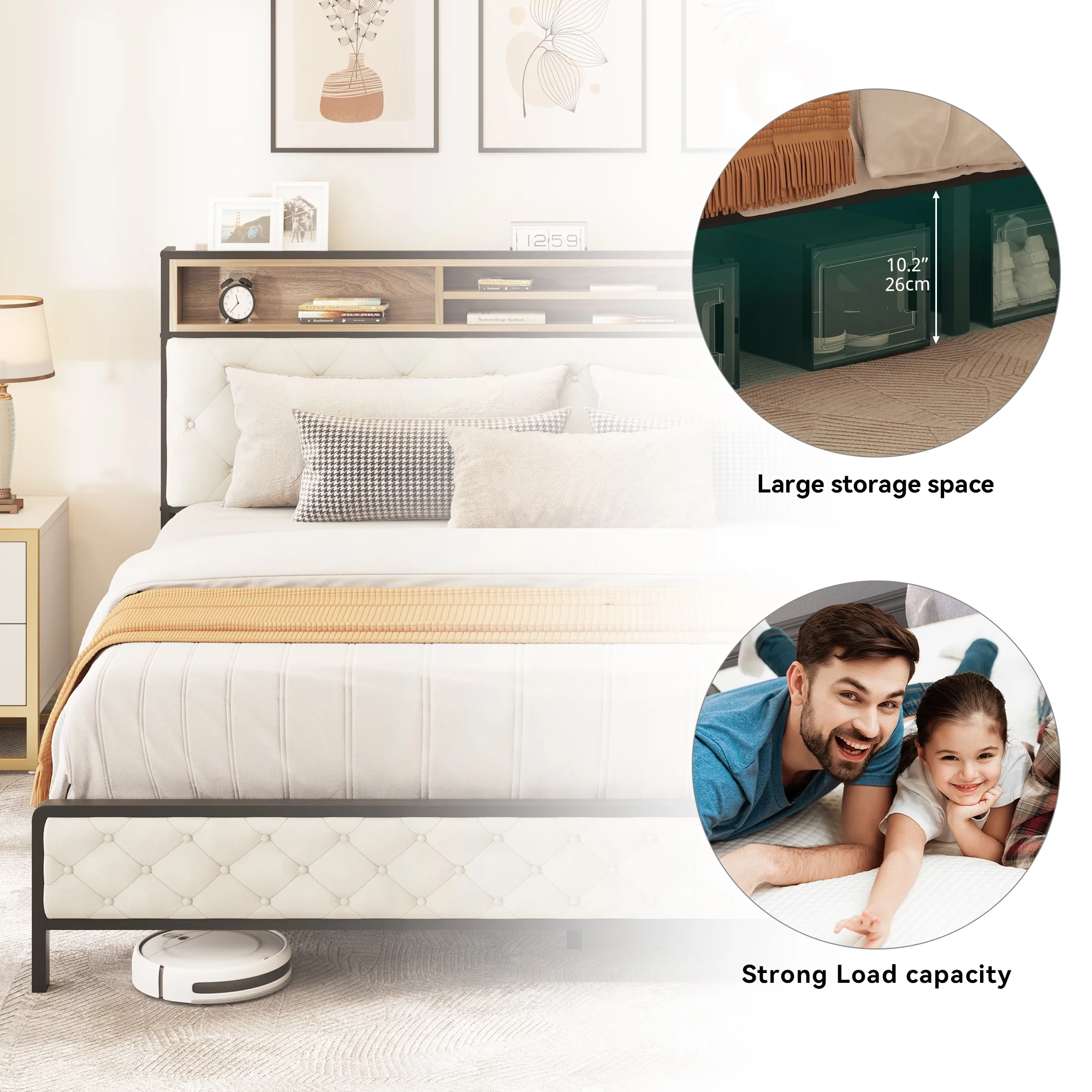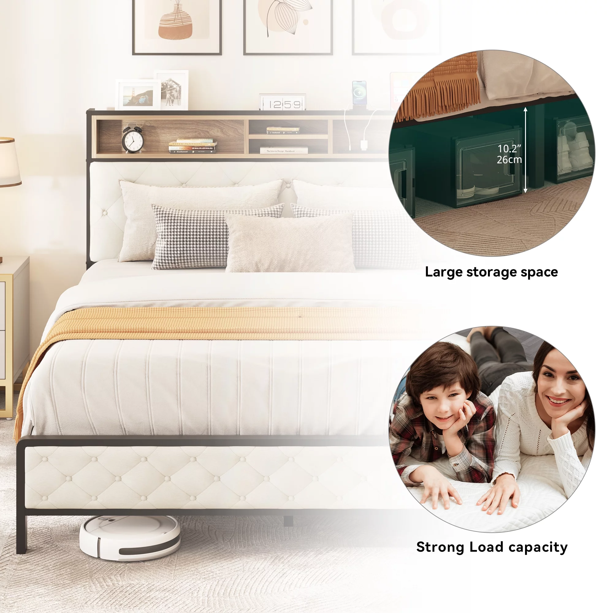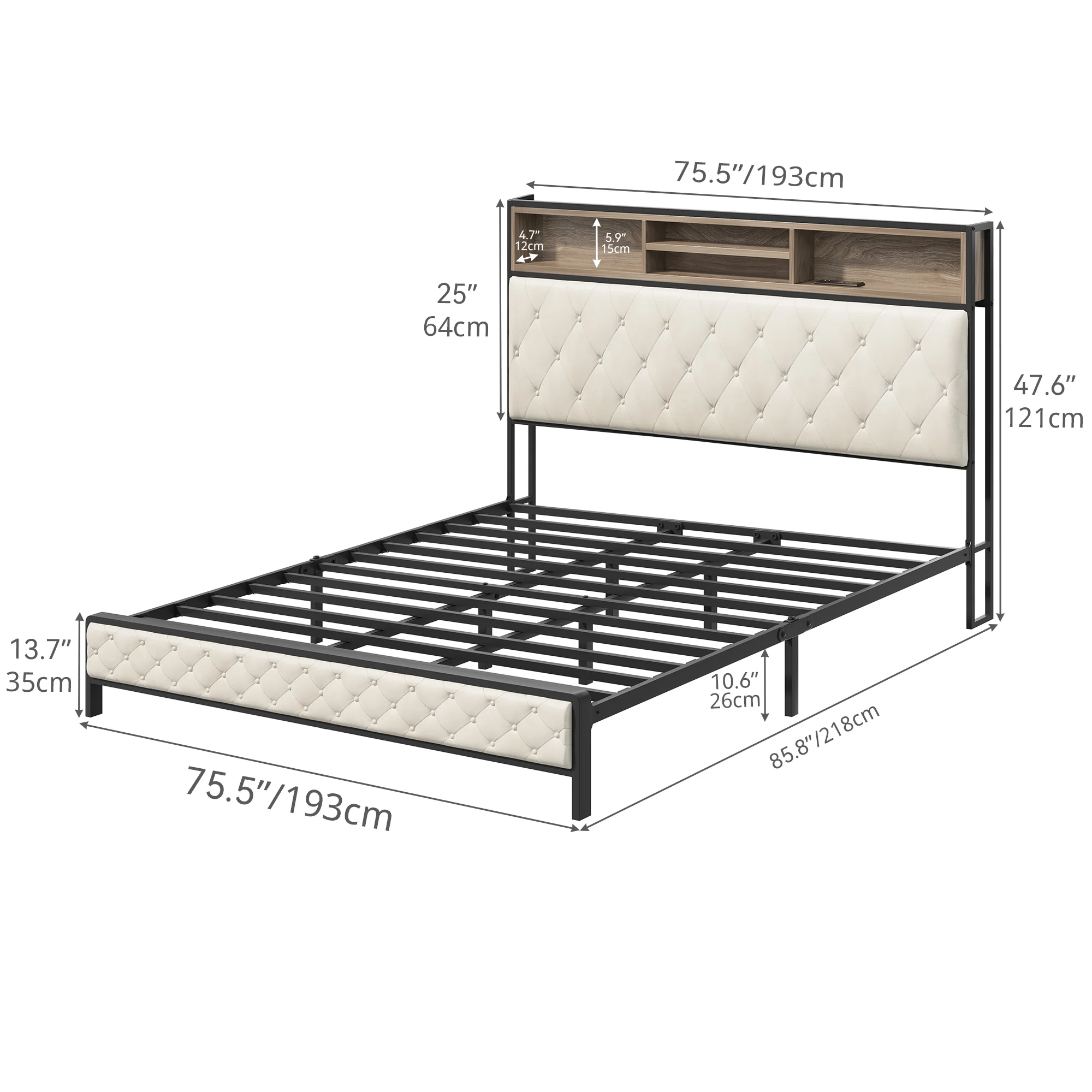 Dextrus Queen Size Bed Frame with Charging Station Footboard Metal Slats, and Storage Headboard, Beige