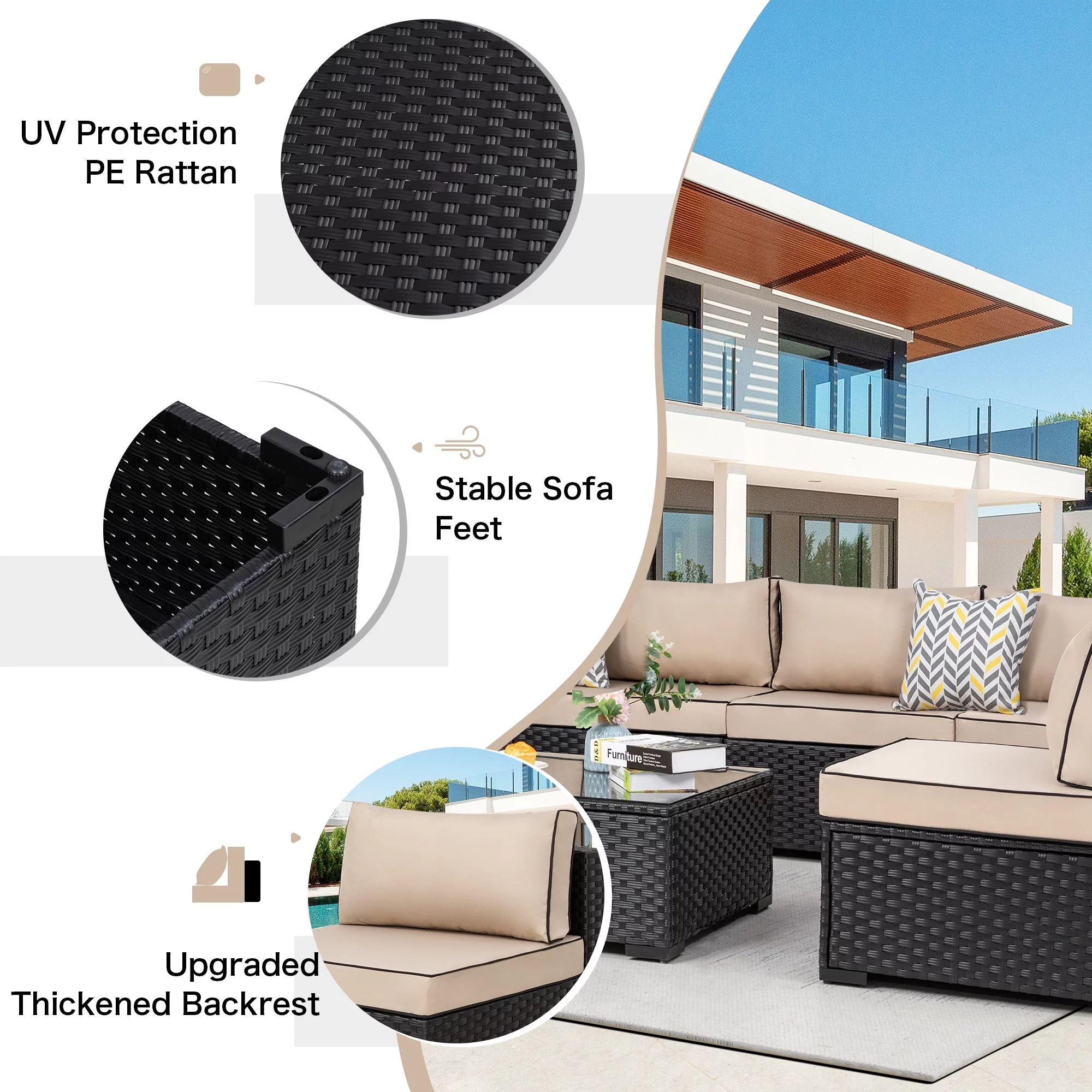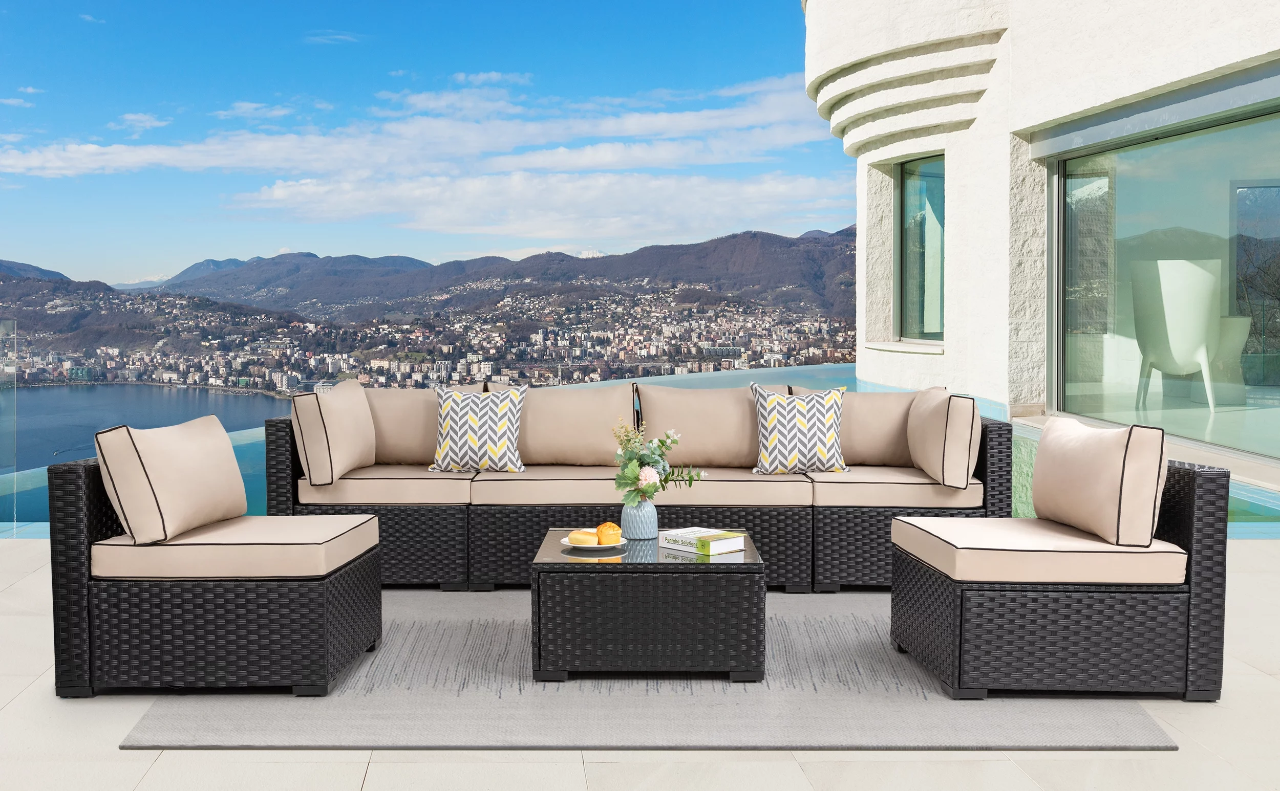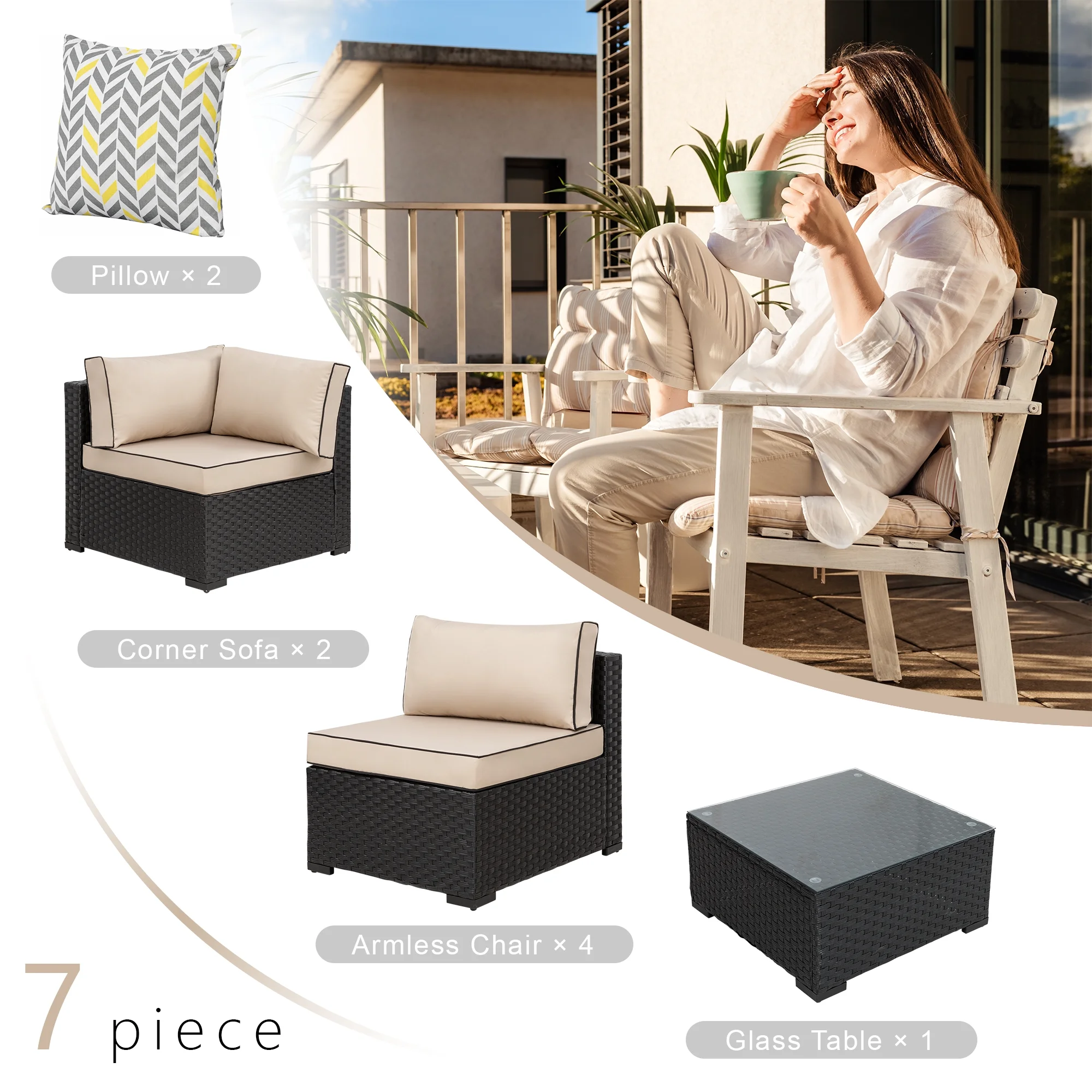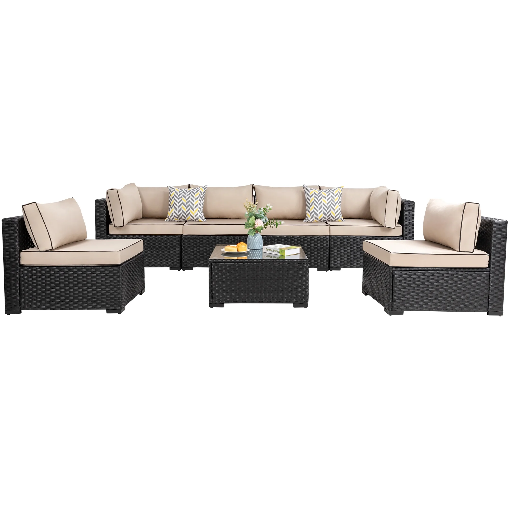7 Piece Patio Furniture Set, Outdoor Furniture Patio Sectional Sofa, All Weather PE Rattan Outdoor Sectional with Cushion and Coffee Table.