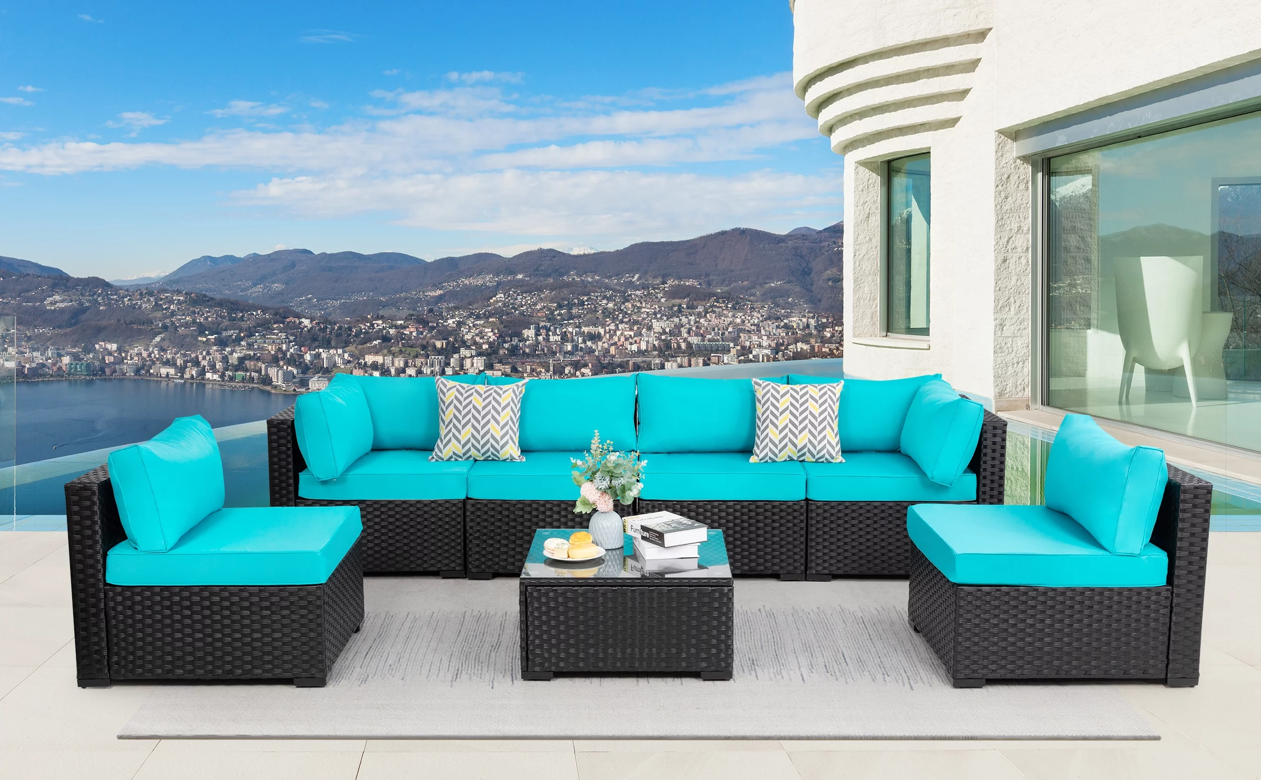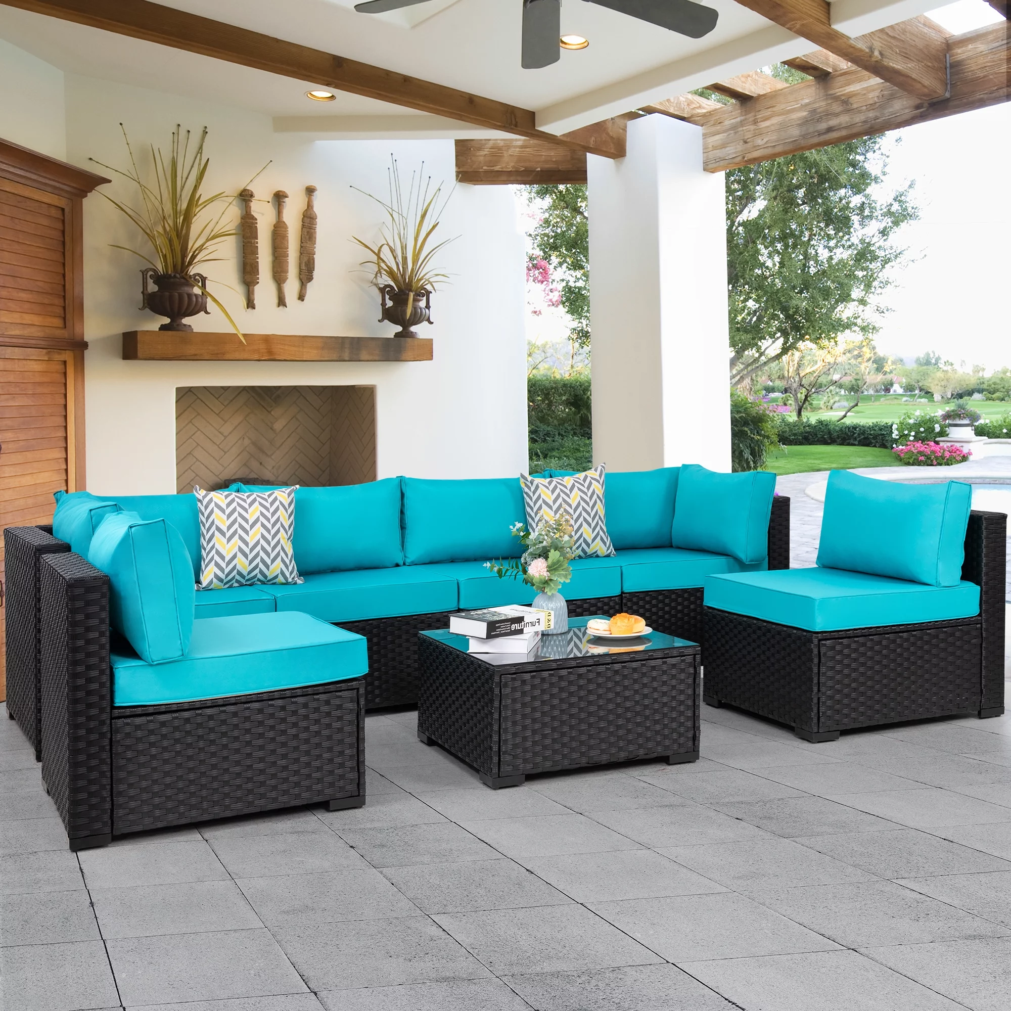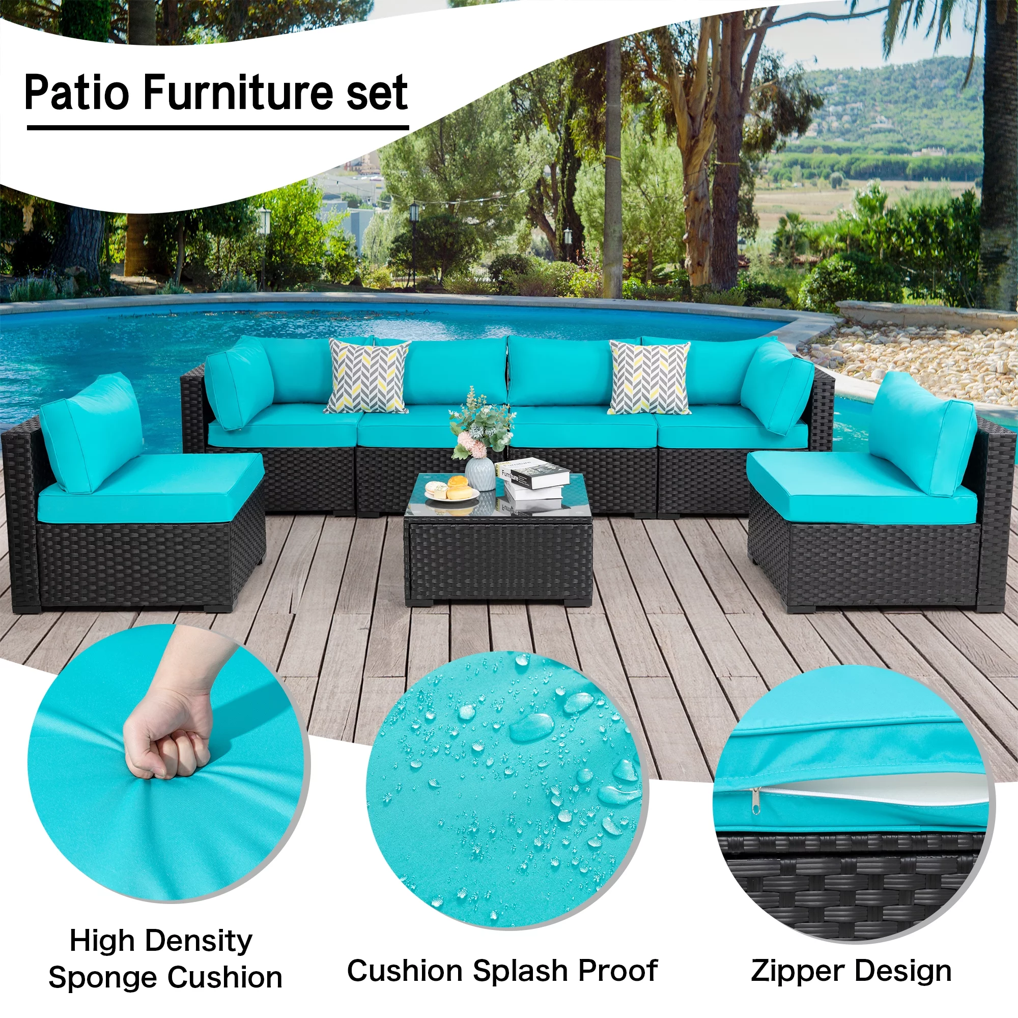 7 Pieces Outdoor Sectional Sofa Furniture Sets, All-Weather Black Wicker Patio Furniture Sets with Tea Table and Washable Couch Cushions Aegean Blue