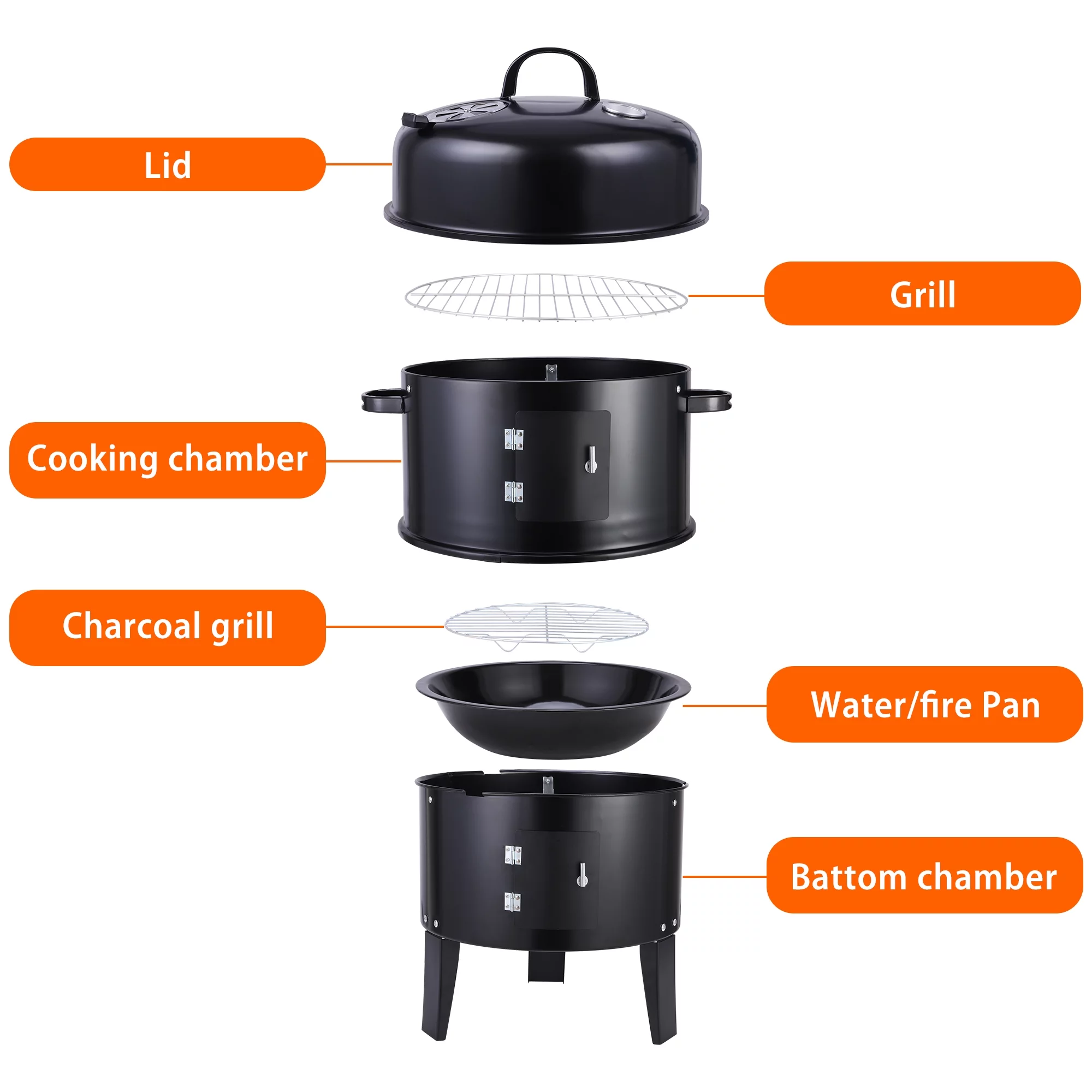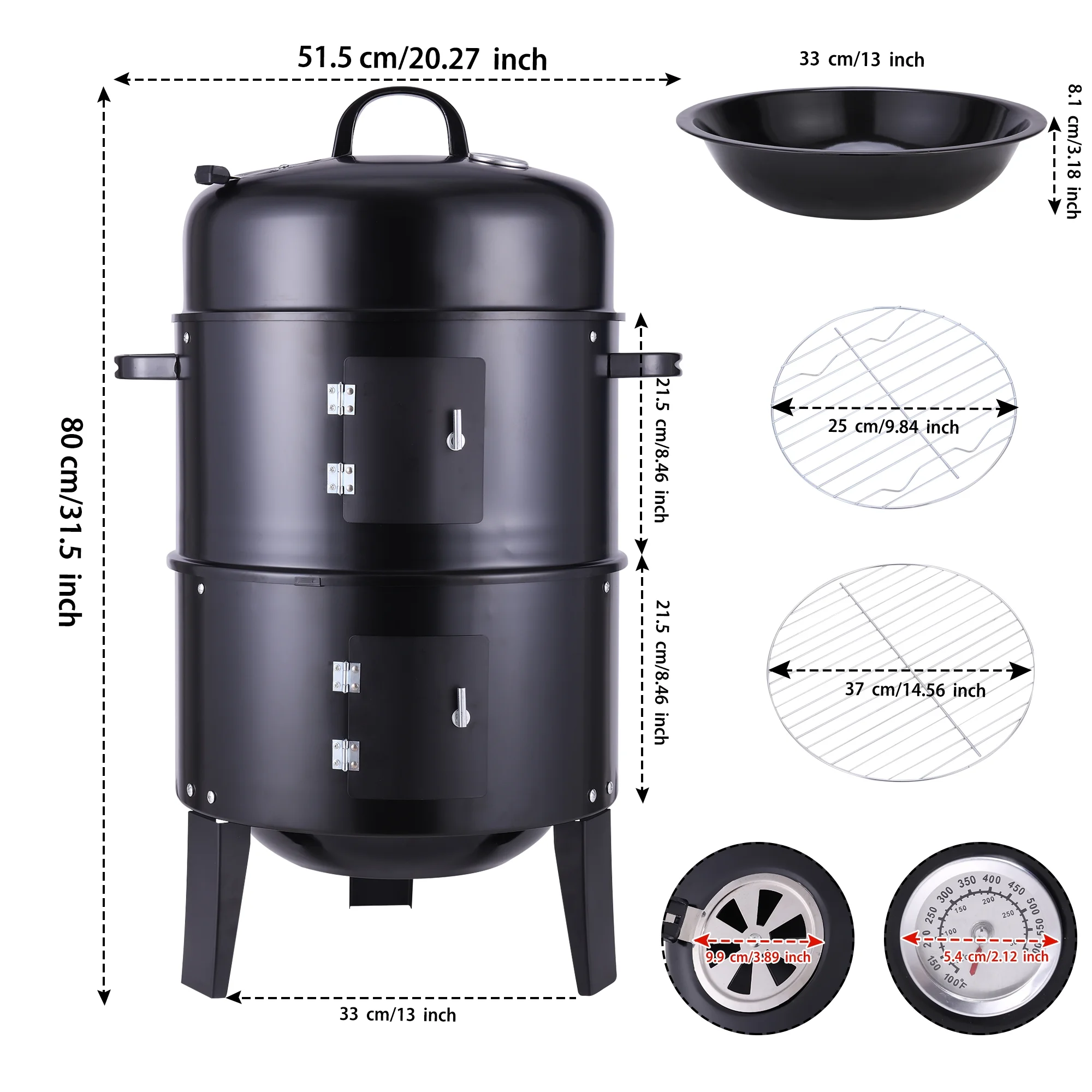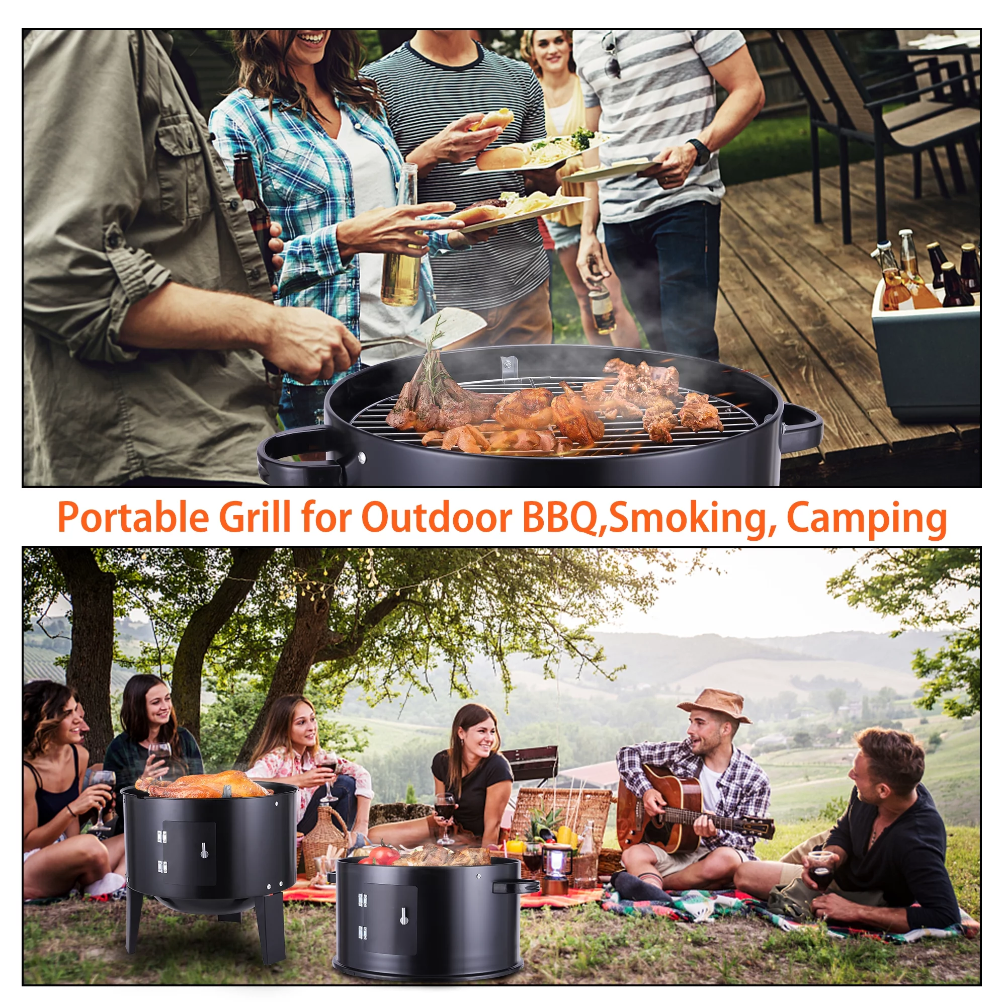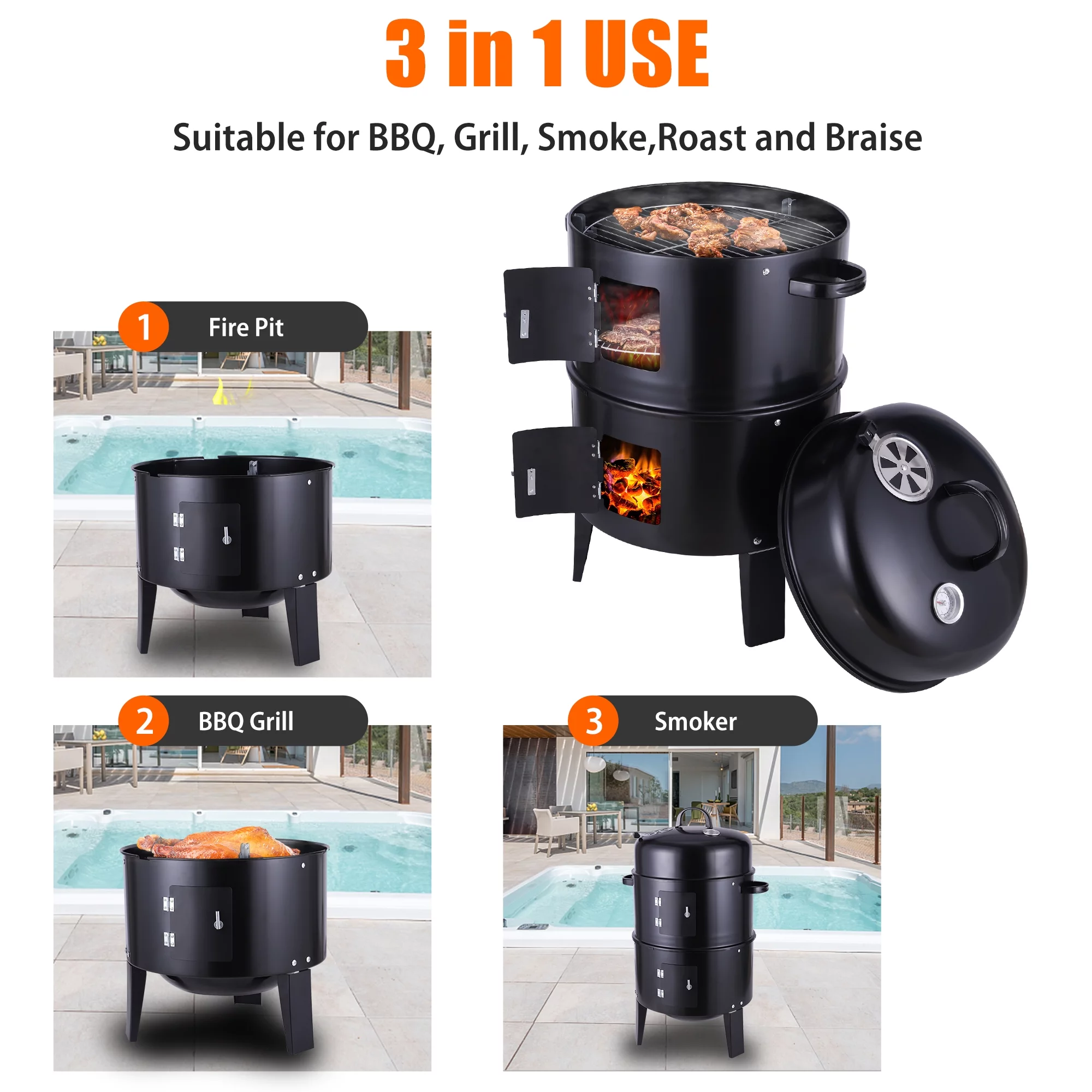 3-in-1 Vertical Portable Charcoal Grill, Outdoor Barbecue Smoker Fire Pit, Small Steel BBQ Grill for Outdoor Picnic, Camping