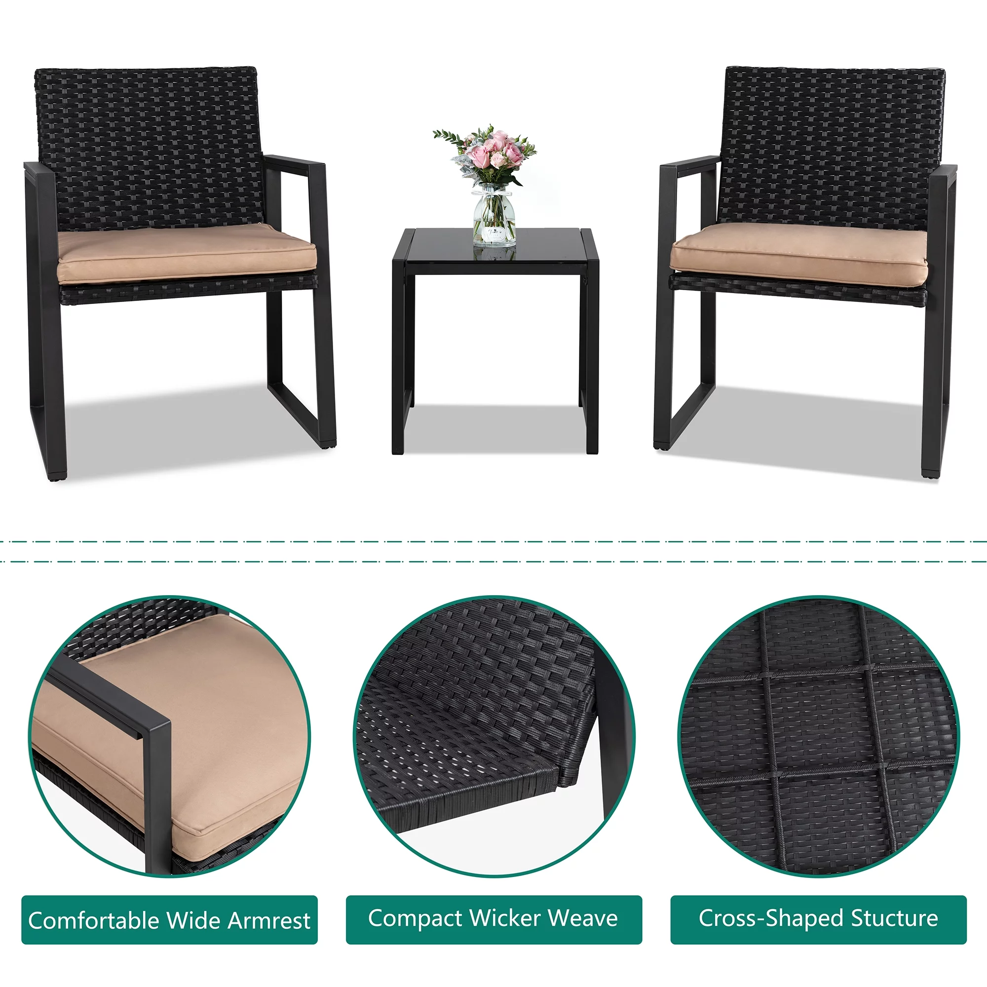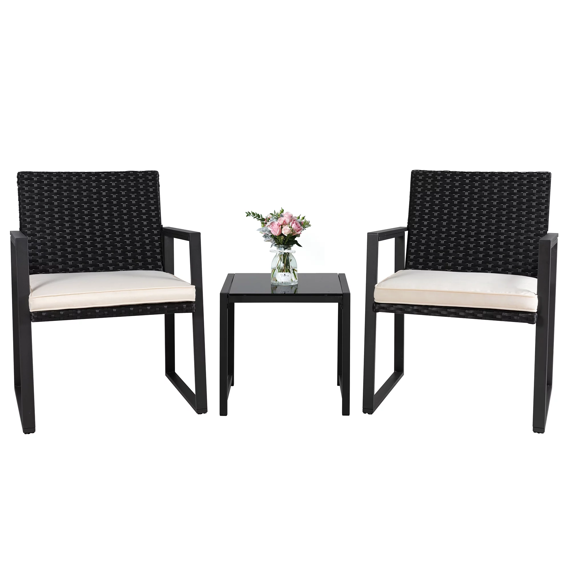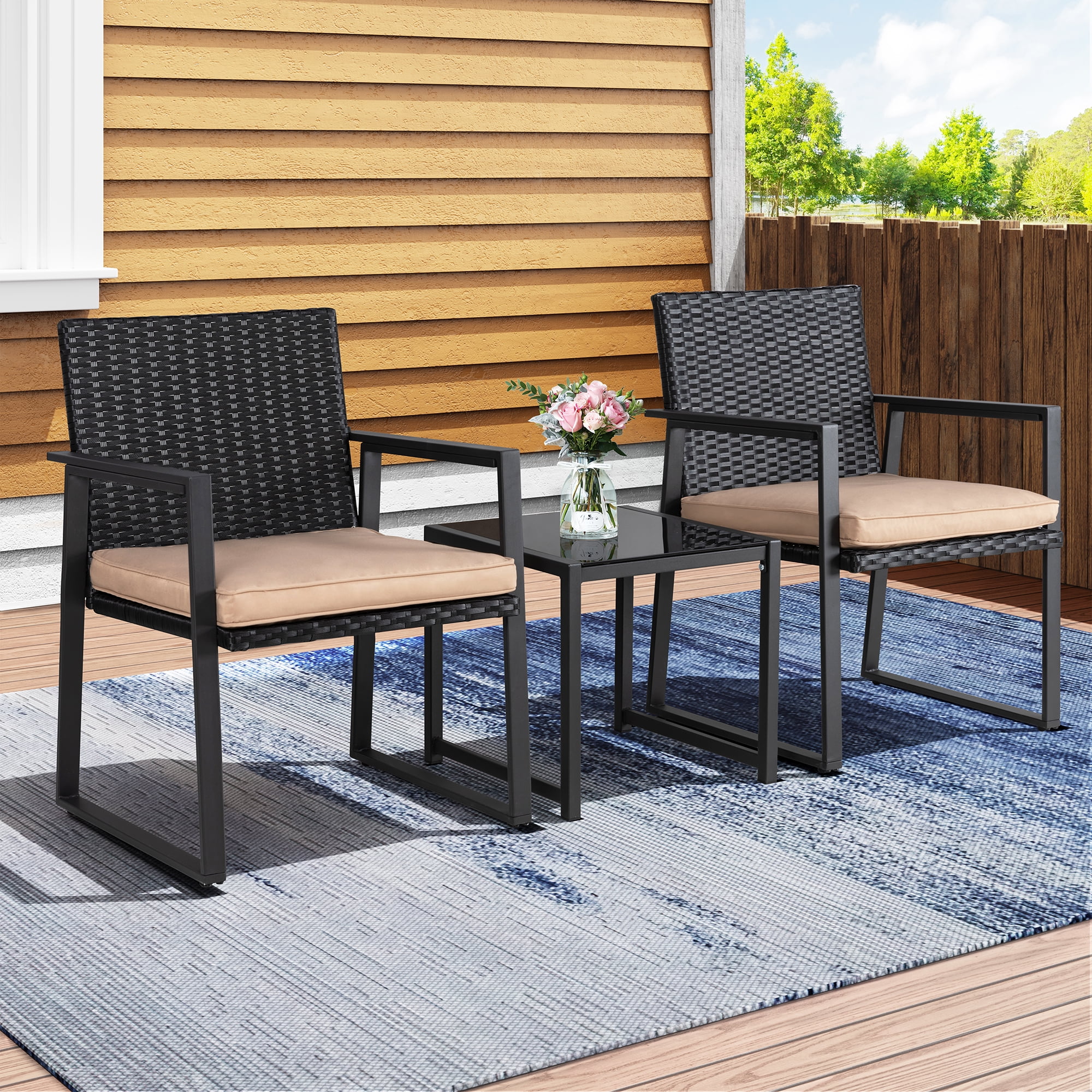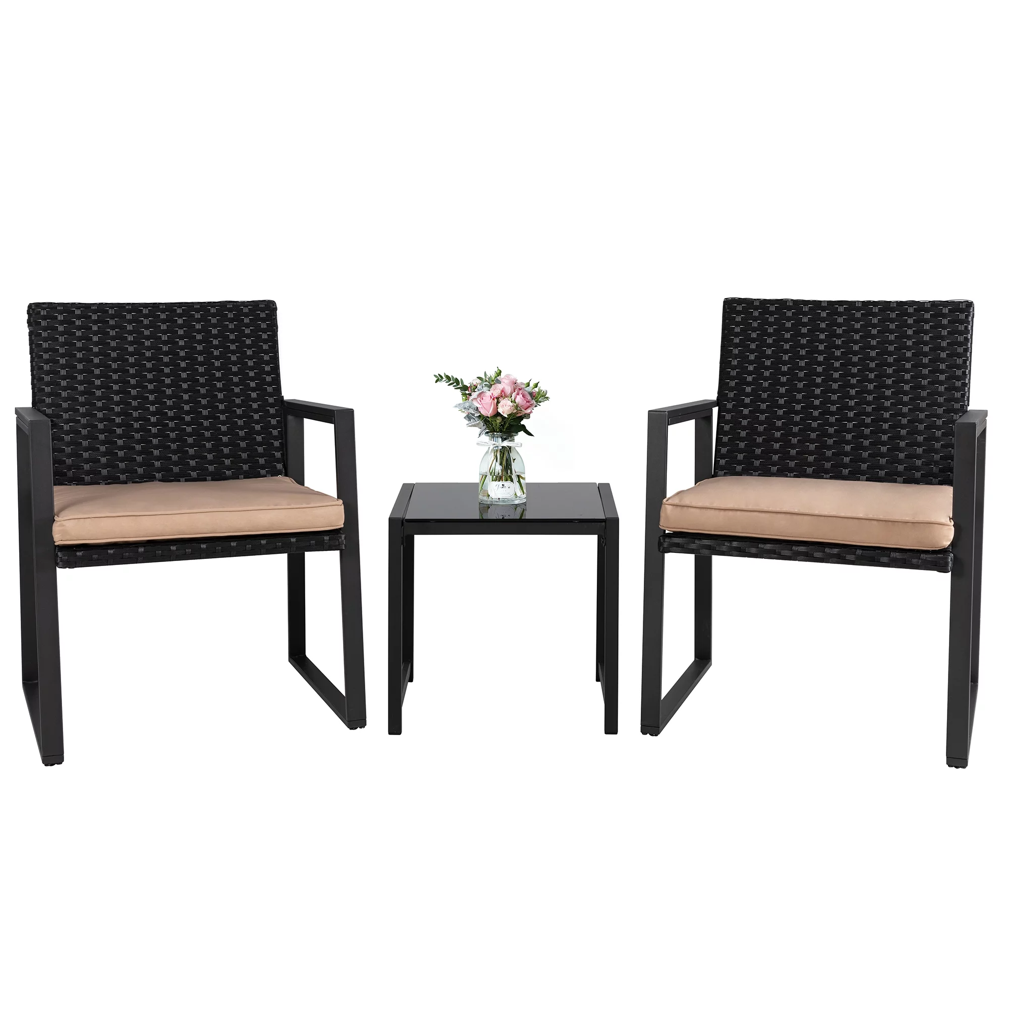 3 Piece Patio Bistro Sets, Outdoor Rattan Chairs & Black Wicker Furniture Conversation Set Biege