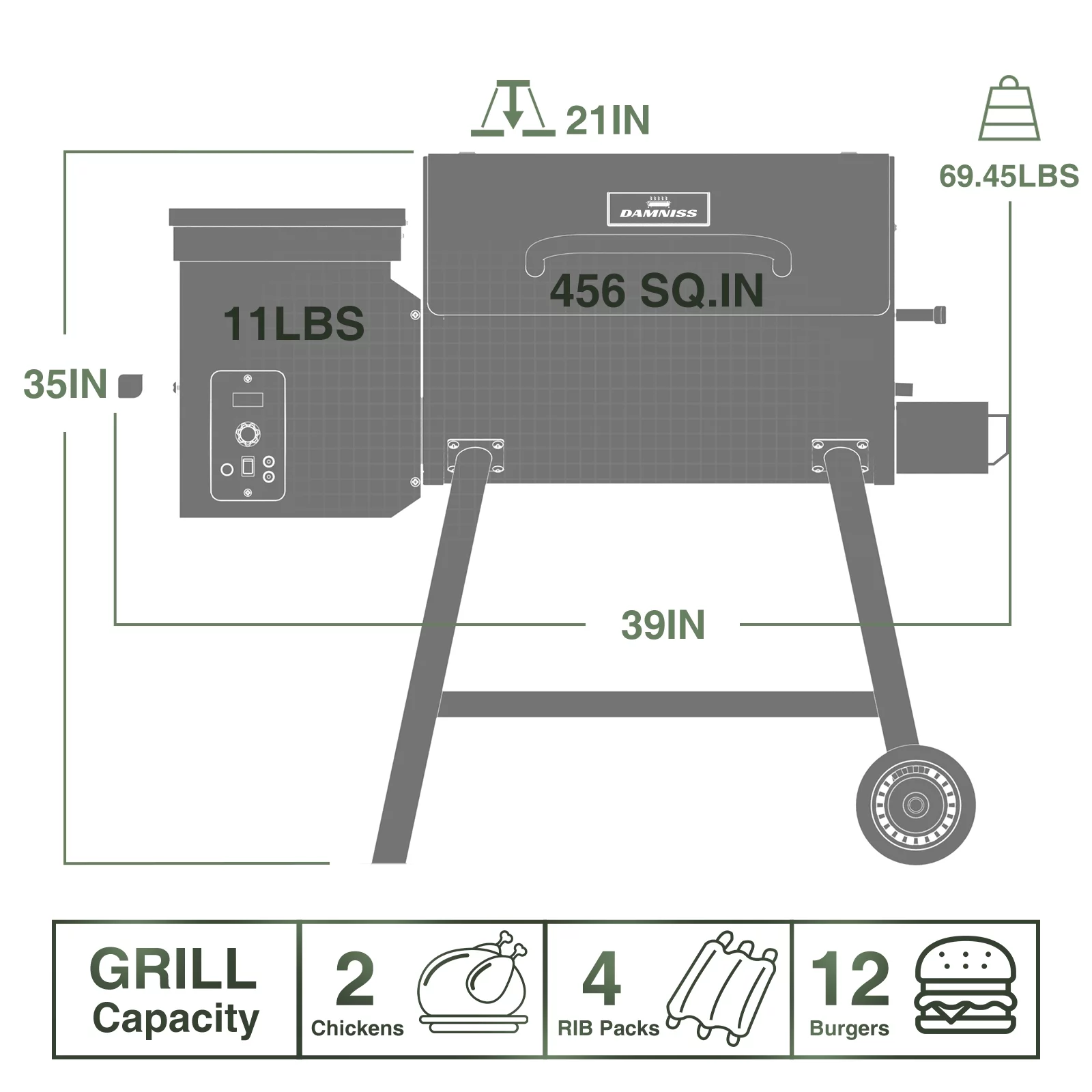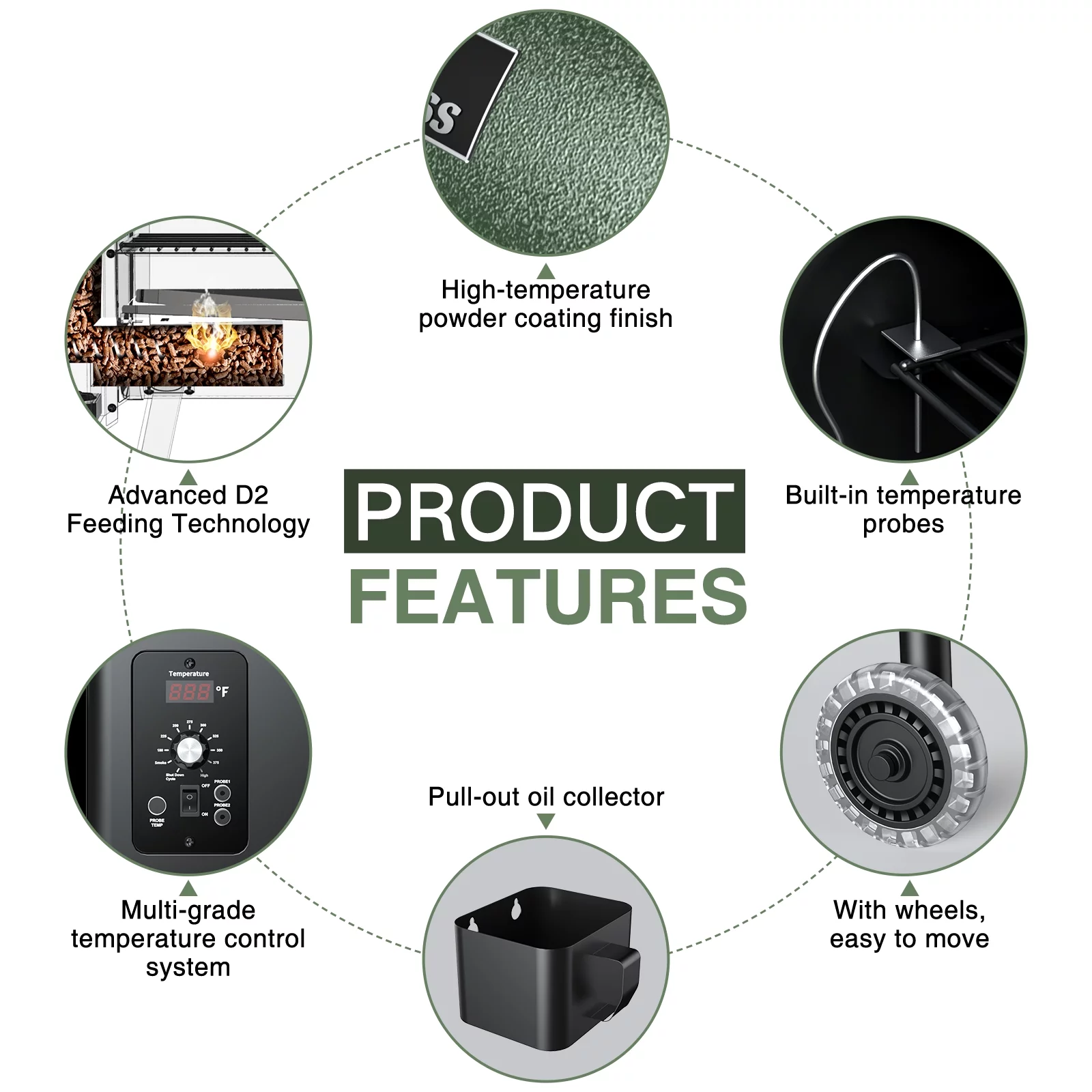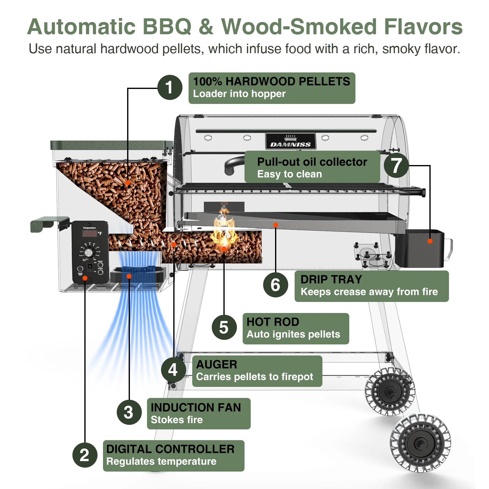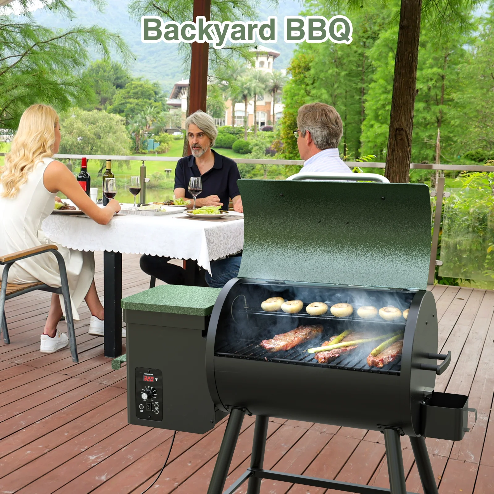 456 SQ.IN Wood Pellet Grill Smoker with Auto Temperature Control for Outdoor RV 8-in-1 BBQ Green with Rain Cover