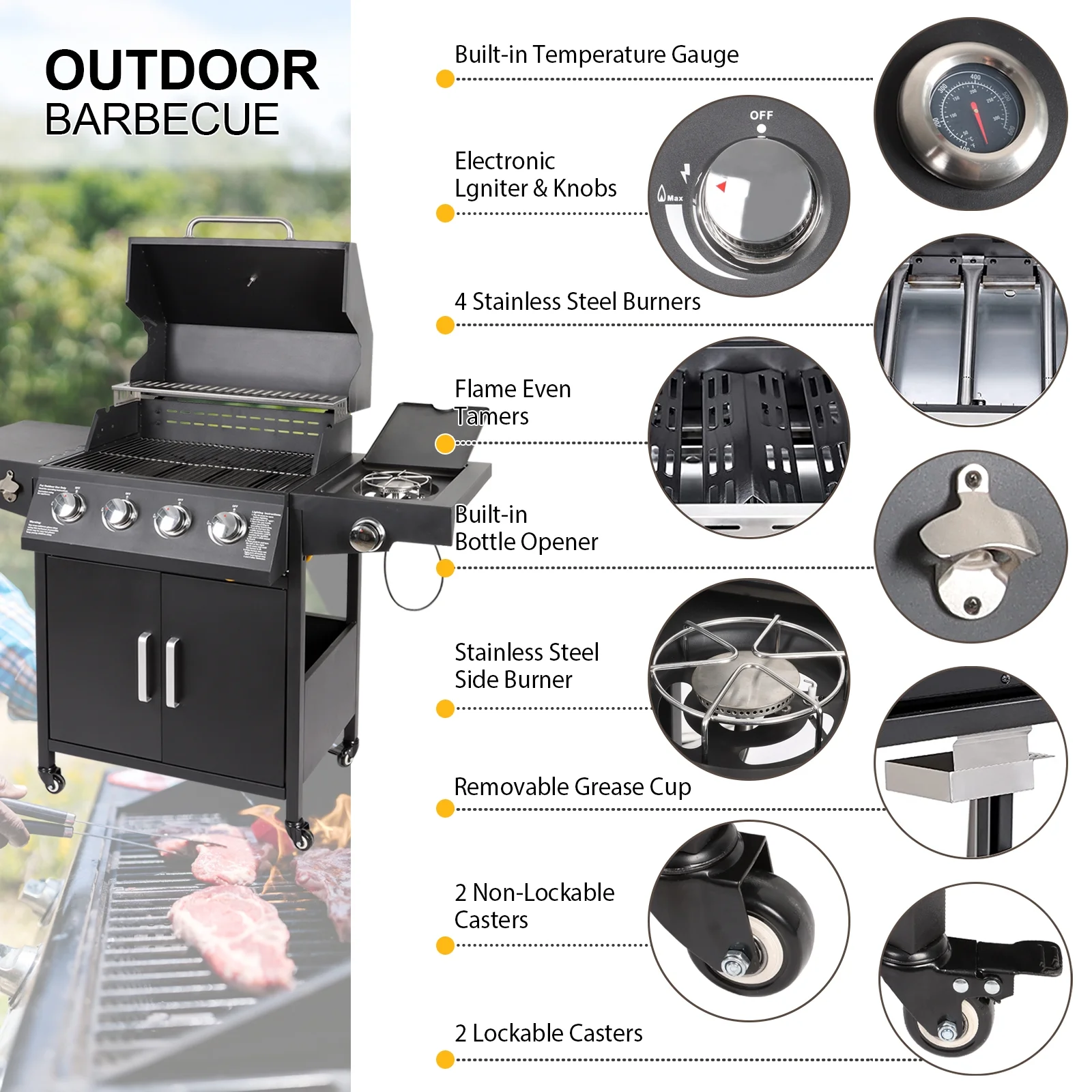 4-Burner Propane Gas Grill with Side Burner and Side Table Outdoor Cooking Barbecue Grill Camping