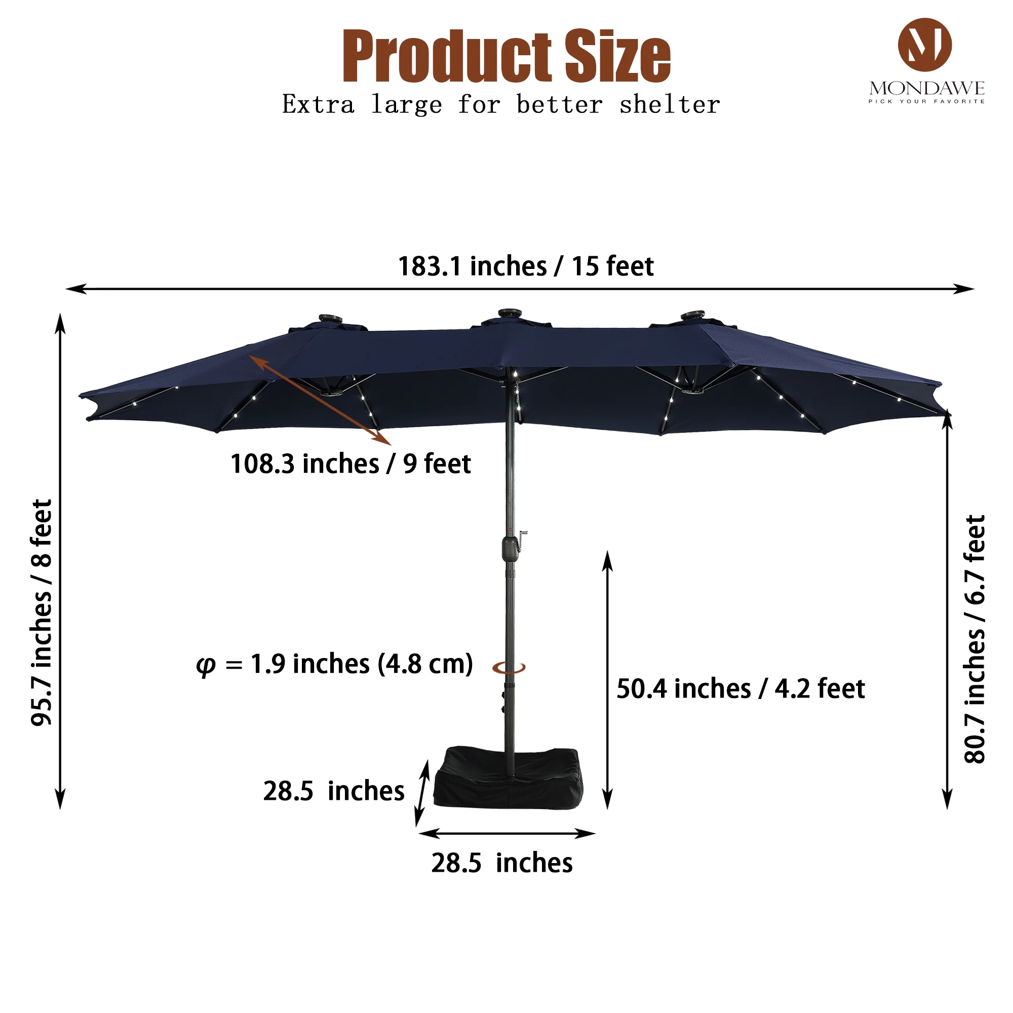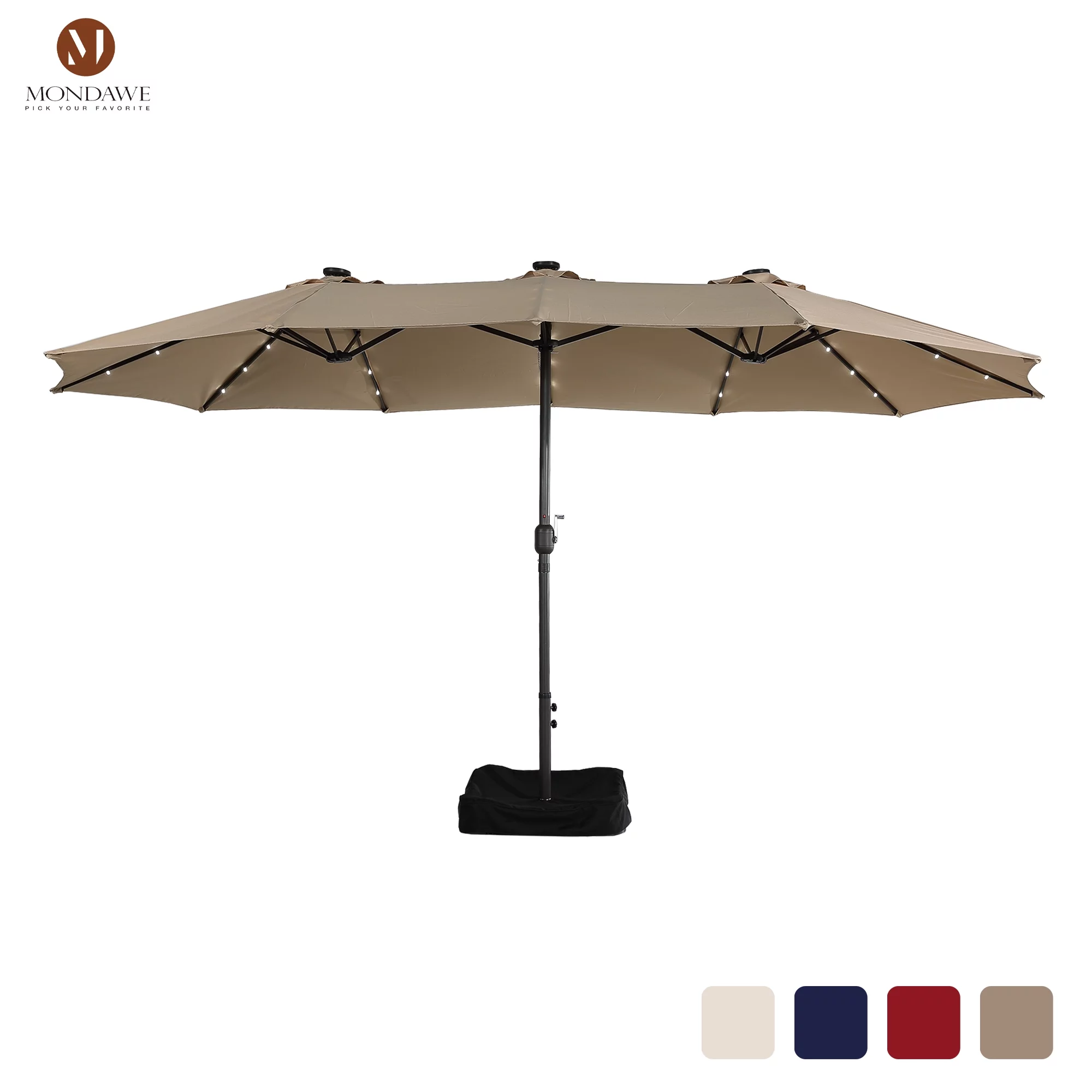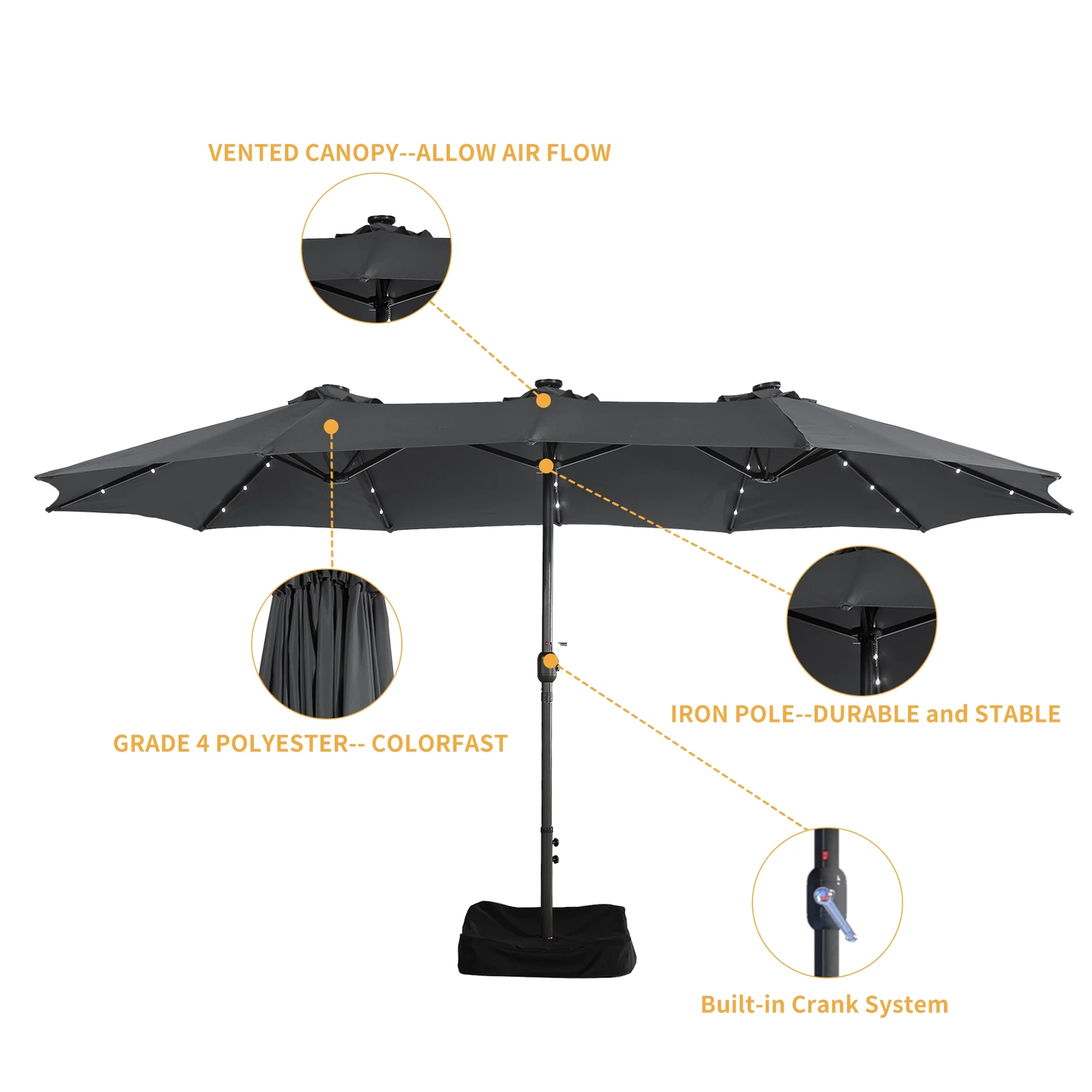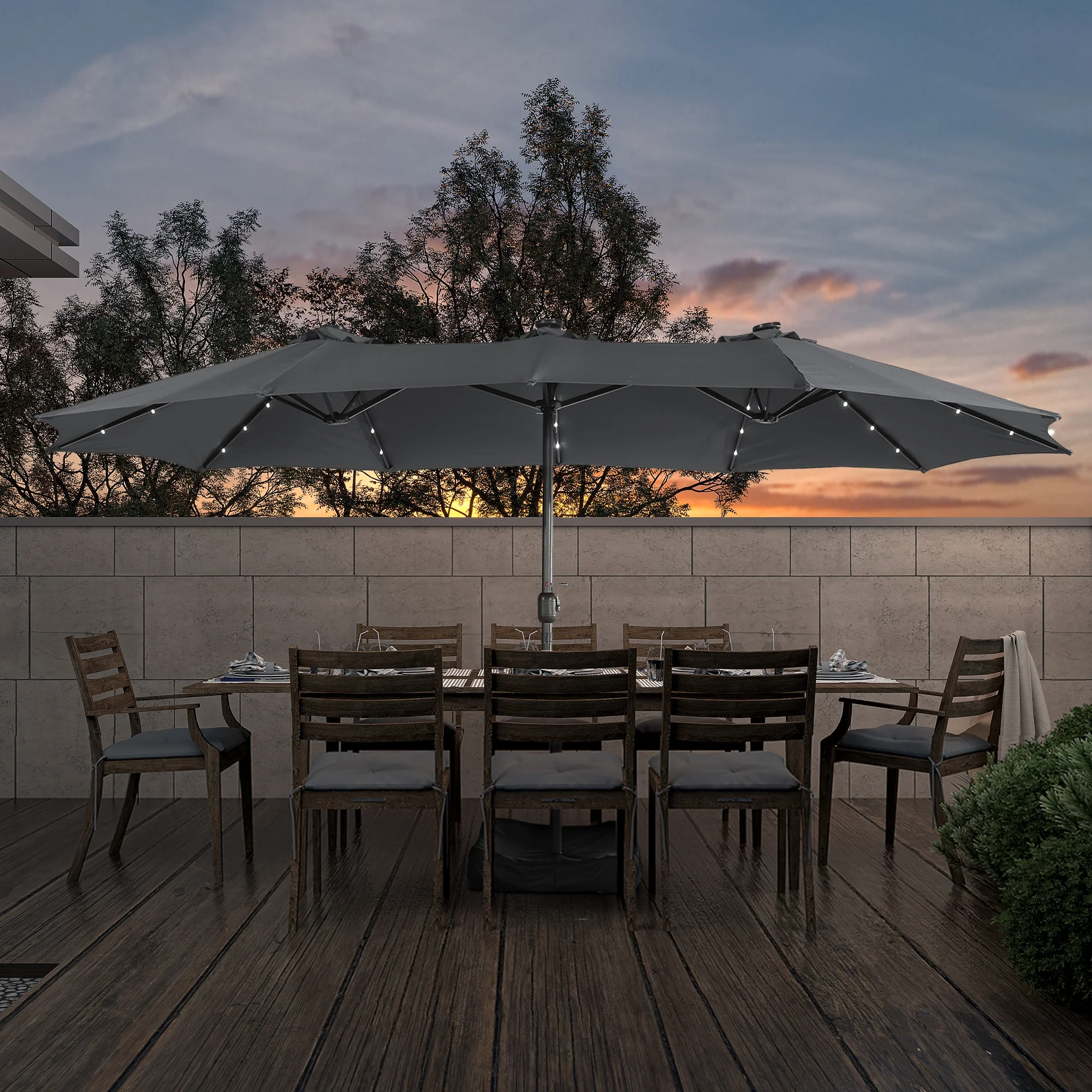 15ft Large Patio Umbrella with Solar Lights, Double-Sided Outdoor Market Rectangle Beach Umbrellas with 36 LED Lights, Umbrella Base (Stand) Included