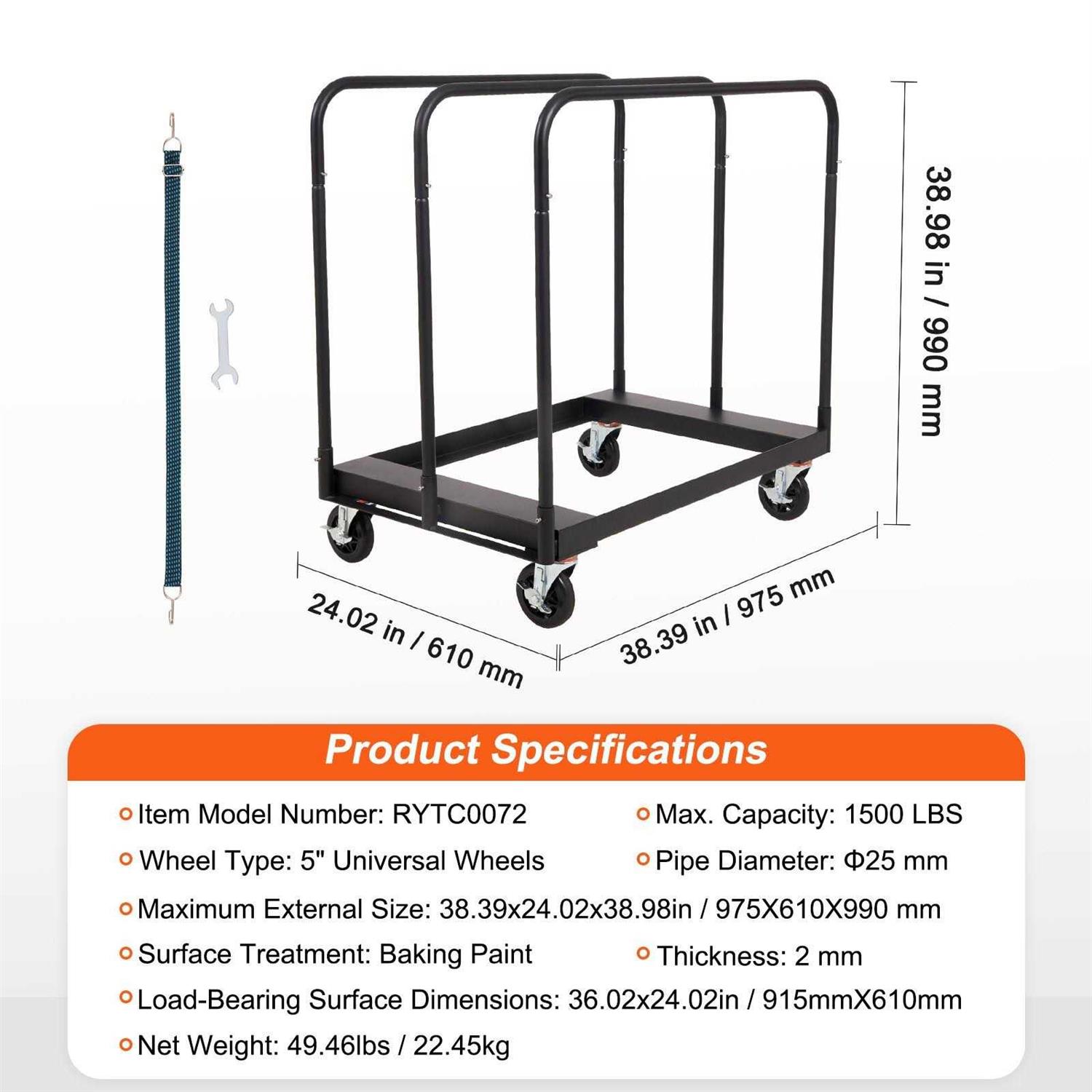 VEVOR Drywall Cart, 1500 LBS Panel Dolly Cart with 36.02 x 24.02 Deck and 5 Swivel Wheels